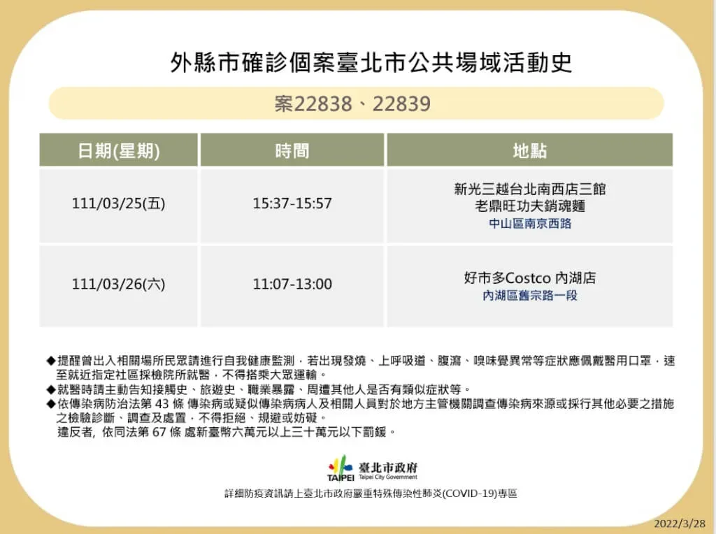 台北市衛生局昨深夜公布6名COVID-19(2019冠狀病毒疾病)確診者在可傳染期的足跡,外縣市個案22838、案22839曾在25日到過新光三越台北南西店三館的老鼎旺功夫銷魂麵、26日到好市多內湖店。