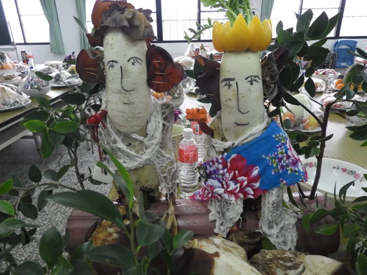 聽潘大姐講,春分過忒一禮拜,還有四門風水愛掛紙,拜六下晝佢兜在文化館裡肚愛做「雕牲」,還有所有掛紙个祭品全部會準備好,拜六下晝䟓工下來,愛看仰般做「雕牲」。吂知去到佢兜講全做好咧,在該文化館裡背桌頂擺好,斯請佢兜開門分𠊎落去看。哇!一間屋,桌頂擺淰淰。