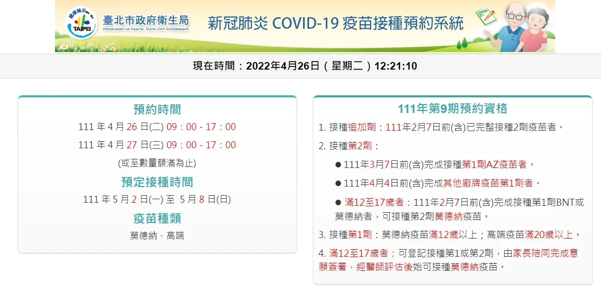 台北市衛生局表示,台北市提供6萬多劑莫德納疫苗、3萬多劑高端疫苗,全部提供9萬1,523劑疫苗,要給民眾預約接種,台北市衛生局提醒,有成功預約的民眾,台北市政府會開放民眾,在下星期5月2日至5月8日,全部讓大家接種完畢。
