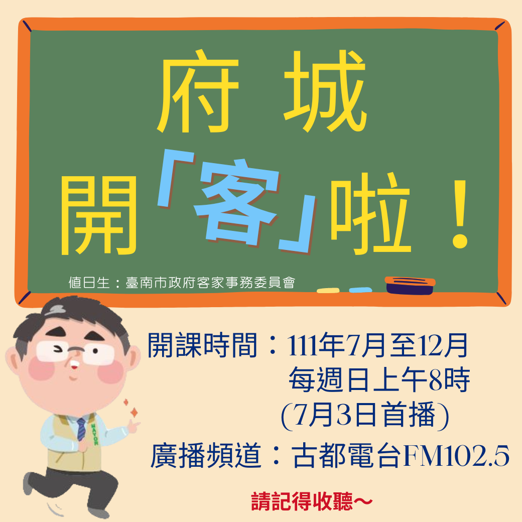 「府城開『客』啦!」節目將在本週日(7月3日)上午8時首播,歡迎鎖定古都電台FM102.5,或者利用電台網址線上收聽。古都電台FM102.5線上收聽:https://hichannel.hinet.net/radio/index.do?id=1143