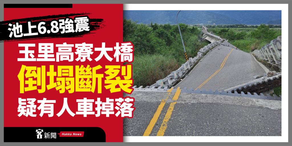 【即時中心/綜合報導】台東池上今天下午2時44分發生芮氏規模6.8地震,最大震度台東6強、花蓮6弱,目前花東地區災情陸續傳出,玉里高寮大橋斷裂,疑似有人車掉落橋下,警消趕往救援。