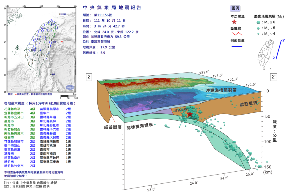 根據中央氣象局資訊,今天凌晨3時24分發生芮氏規模5.9地震,地震深度17.9公里,震央在花蓮縣政府東方59.3公里(位於台灣東部海域),最大震度花蓮縣、宜蘭縣4級。