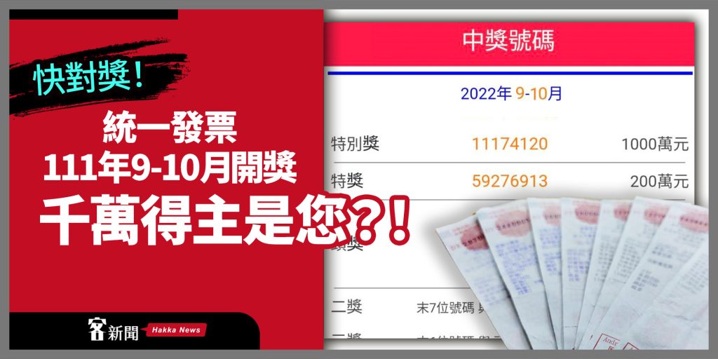 今年9、10月統一發票中獎號碼,下午1時30分在東森財經台直播開獎。中獎號碼如下,特別獎(新台幣1000萬元)11174120;特獎(200萬元)59276913;頭獎(20萬元)3組分別為18079936、20591738、64500205。