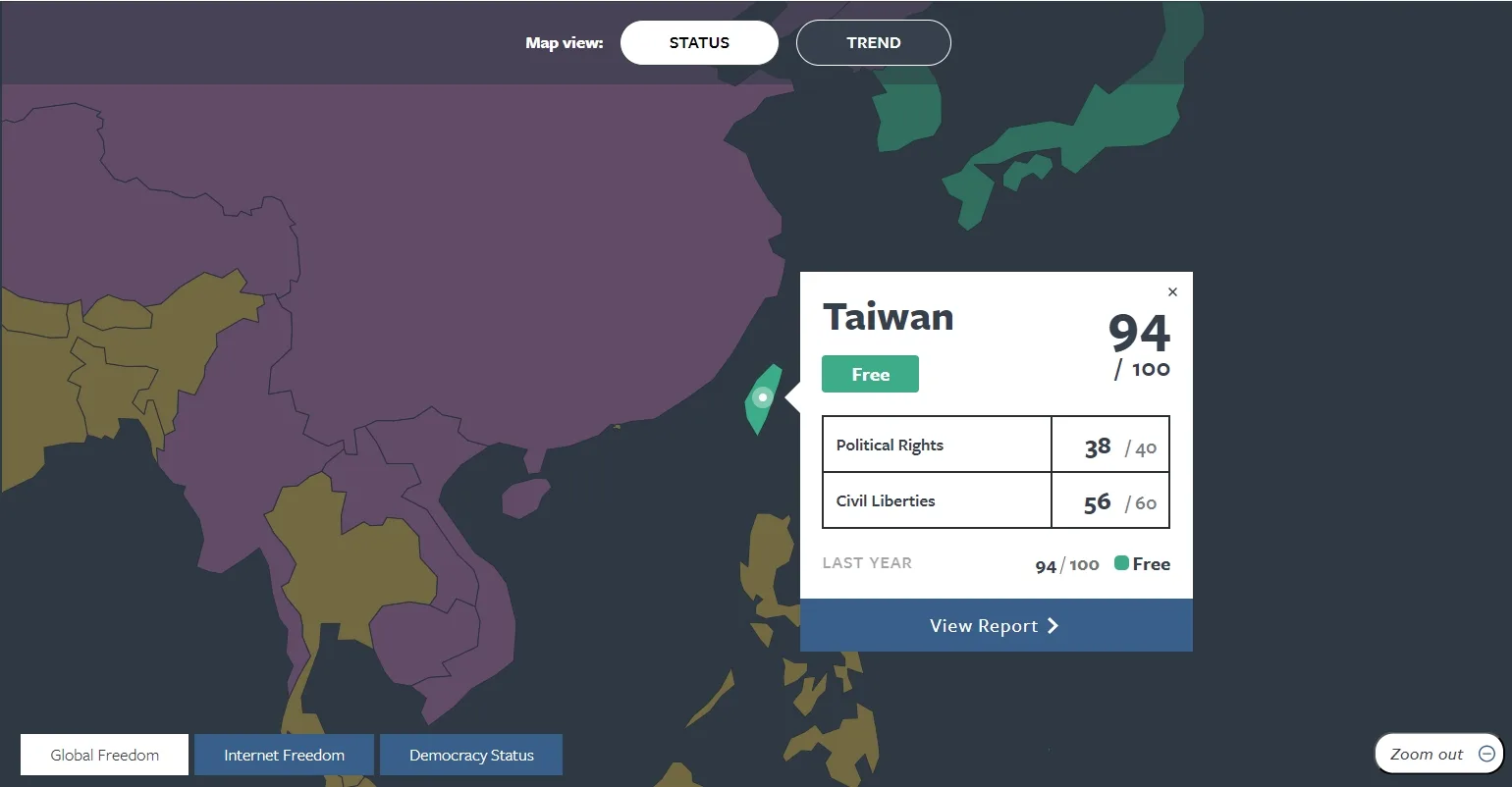 台灣全球自由度亞洲第2 中國持續不自由