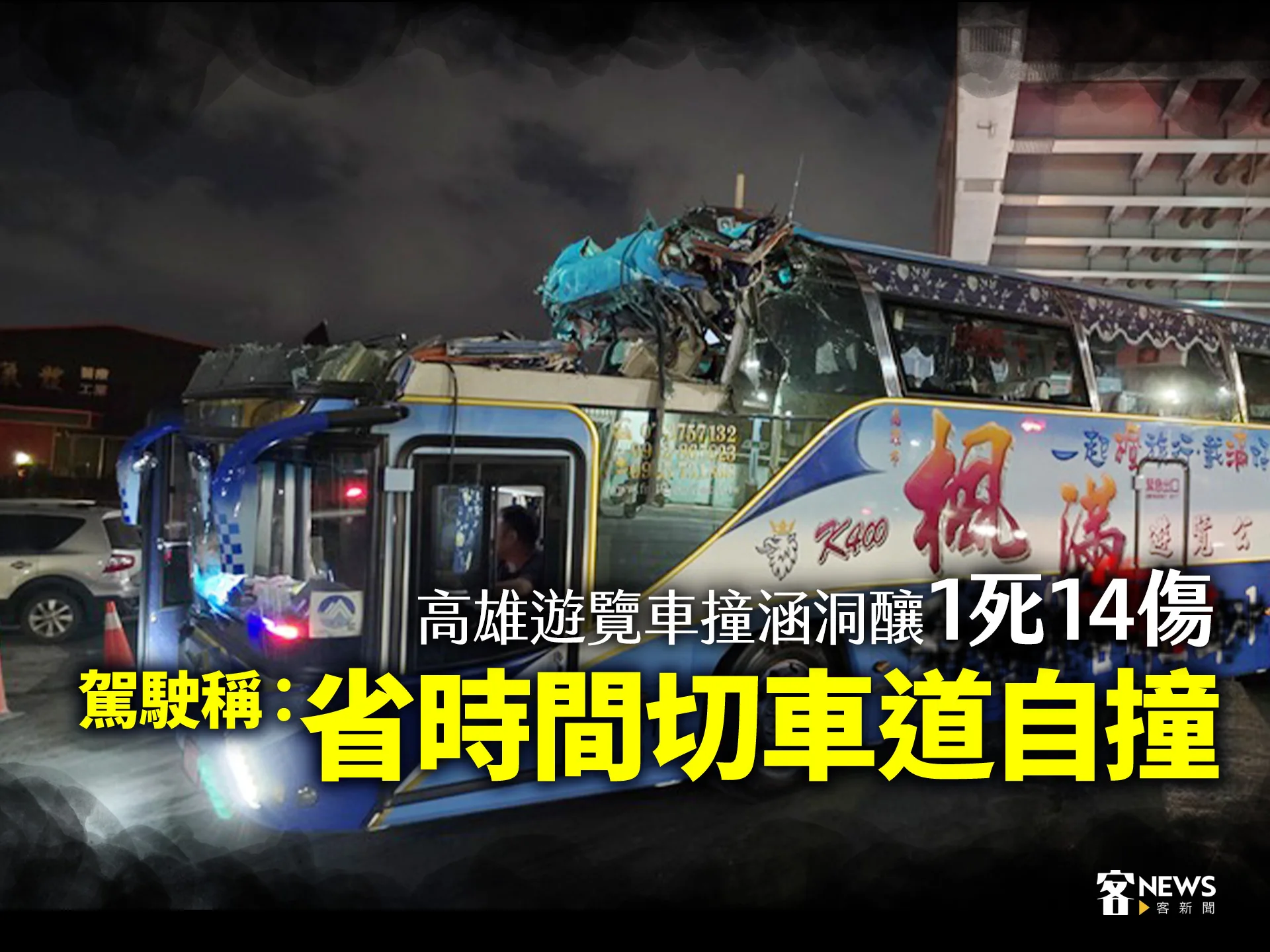 高雄市一輛遊覽車昨(20)日晚間行經仁武區自撞涵洞,造成14人輕重傷、80歲周姓男子死亡;56歲鄧姓駕駛向警方供稱,為省時間切換車道才自撞,詢後被依過失致死罪嫌移送。