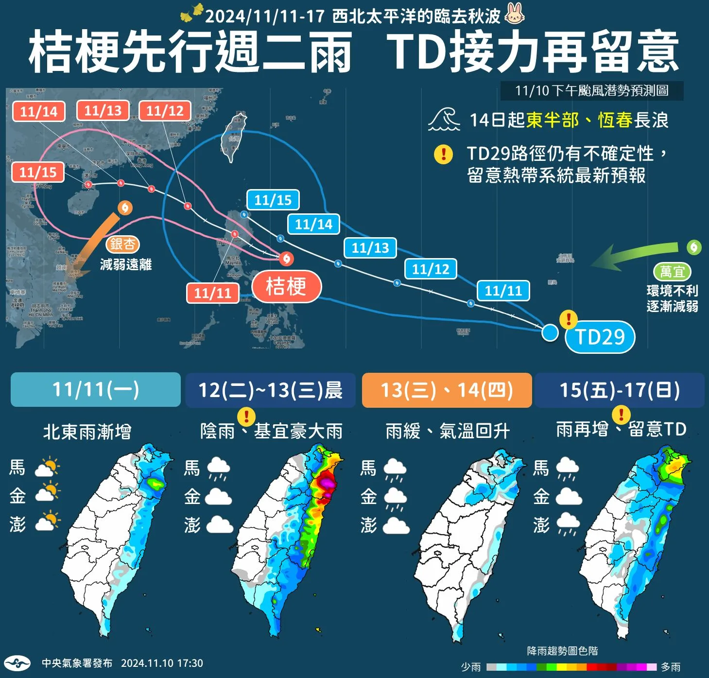 颱風發展情形,氣象署說颱風天兔最快今晚生成,14日會是後期路徑轉折時間點,須持續觀察。明天(12日)起東北季風影響至13日清晨,北部及東北部轉涼、水氣最盛,東北部防局部豪雨。