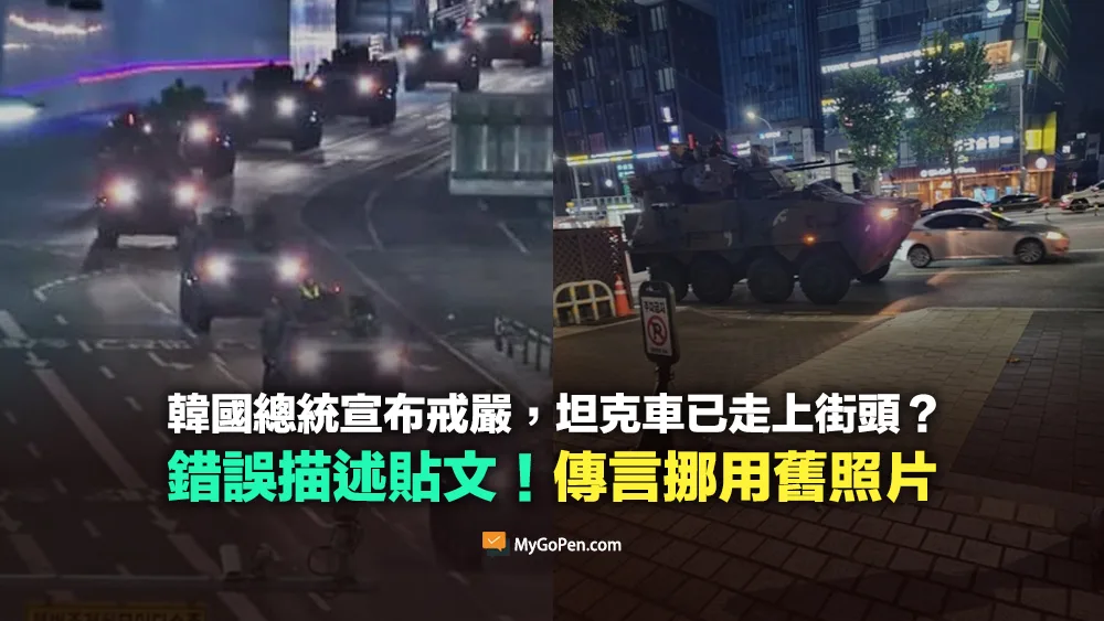 MyGoPen 實際向韓國法人團體「韓國言論振興財團」(한국언론진흥재단)求證,媒體振興室媒體教育組科長洪柱英(홍주영,暫譯)表示,韓國宣布戒嚴當晚的確動員了多架直升機,戒嚴部隊也封鎖了國會,但有派出坦克車的說法是假新聞。