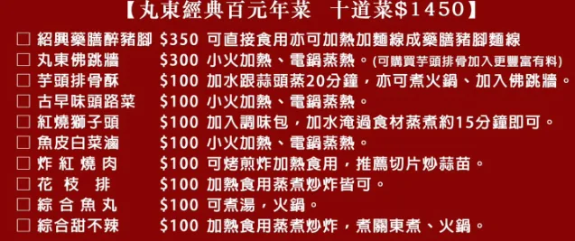 10道年菜、1450元的菜單包括:紹興藥膳醉豬腳、丸東佛跳牆、芋頭排骨酥、古早味頭路菜、紅燒獅子頭、魚皮白菜滷、炸紅燒肉、花枝排﹑綜合魚丸、綜合甜不辣。