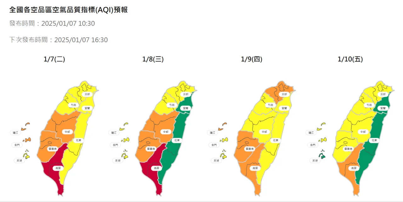 環境部空氣品質監測,7日至10日空氣指標預報。環境部提供