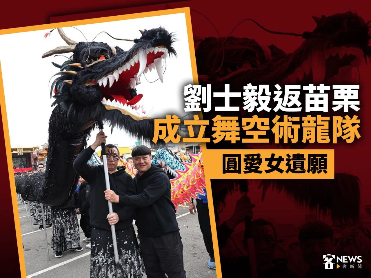 「舞空術龍隊」去年以充滿仙氣的白龍,首度在苗栗元宵節慶火旁龍亮相,劉士毅指出,今年製作出威武的黑龍同樣吸引眾人目光,在客家龍競技比賽中拿下御龍獎。