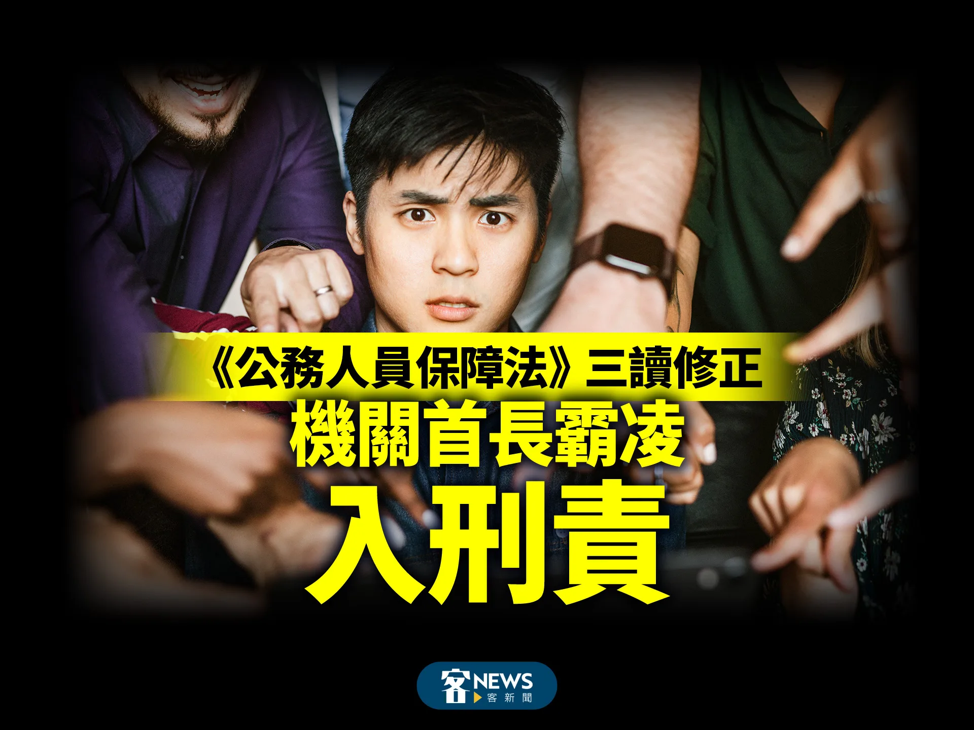 【要聞中心/綜合報導】立法院在朝野支持下,今天(24日)三讀修正通過《公務人員保障法》部分條文修正草案,明確定義職場霸凌、完善申訴處理機制、追究行為人行政責任等,機關首長或一級單位主管人員若遭認定職場霸凌,最高可罰100萬元。