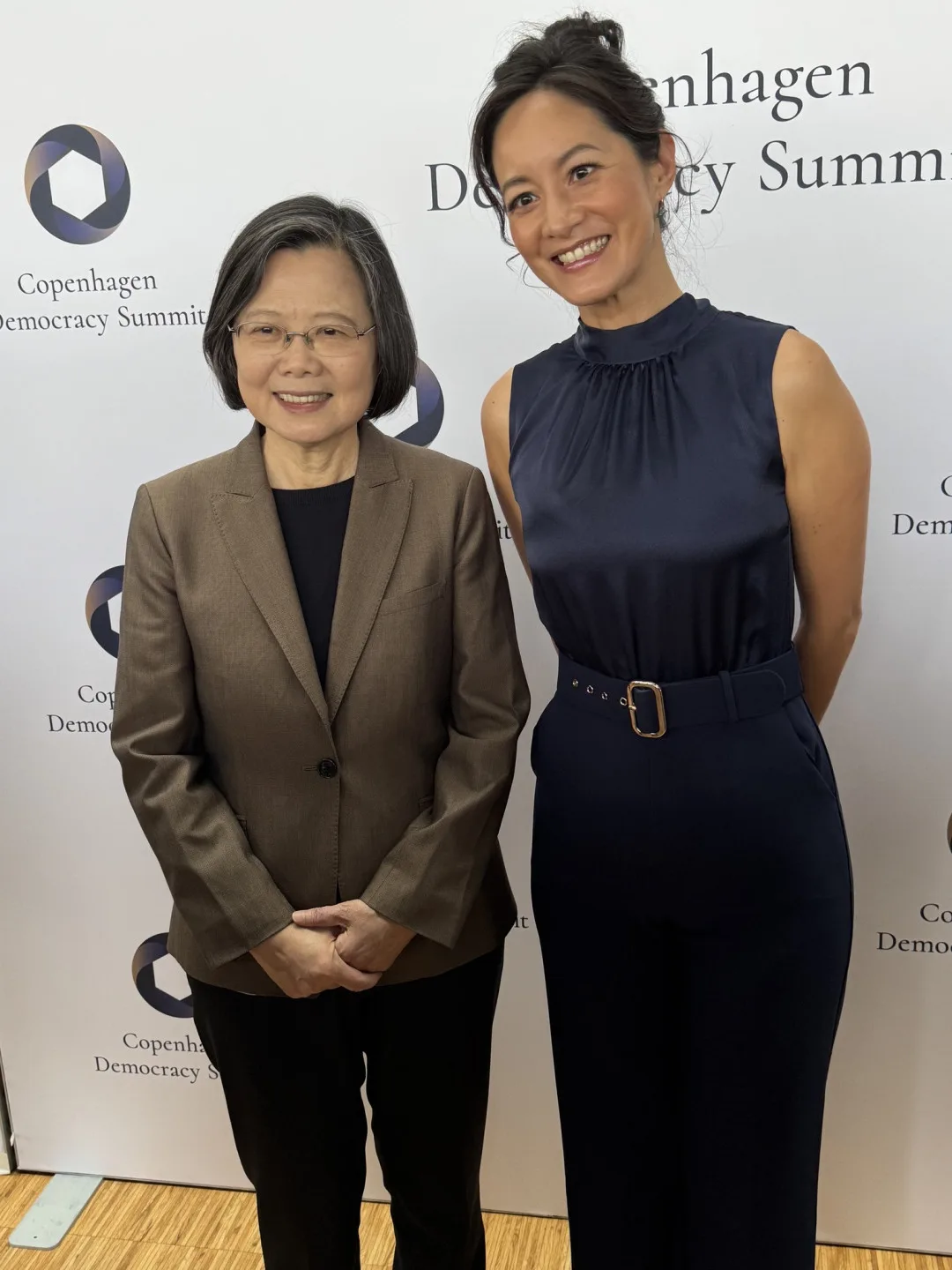 《零日攻擊》今年5月於哥本哈根民主高峰會進行世界首映,前總統蔡英文與飾演總統的Janet合照。翻攝自零日攻擊 ZERO DAY FB