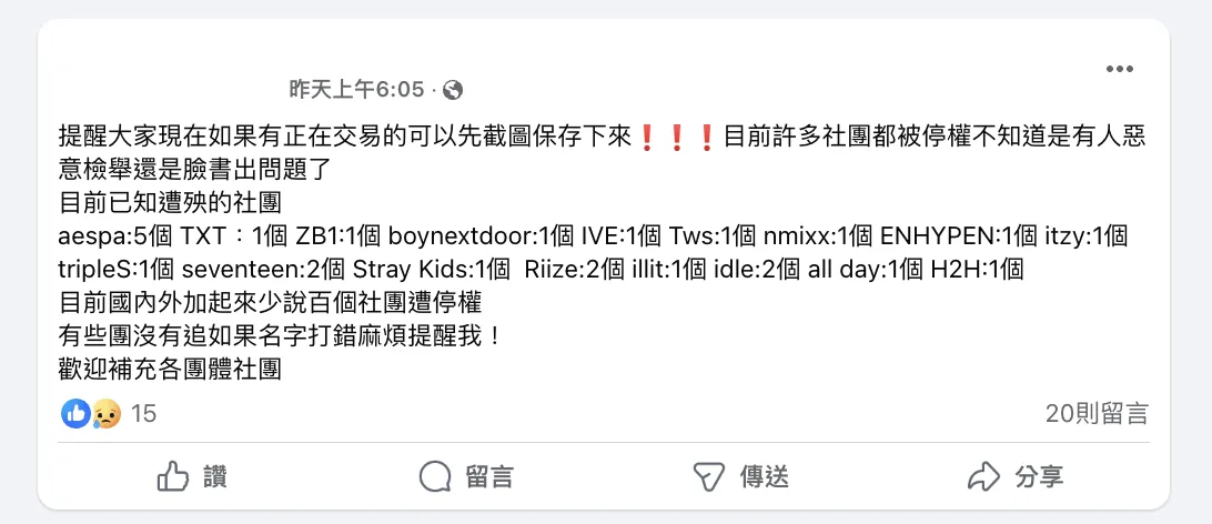 除了「二次元」社團,就連韓國明星社團也遭殃,就有管理者整理出社團名單,並提醒社團成員,若有在社團內進行買賣交易的,請事先截圖保存下來,以防找不到資訊。