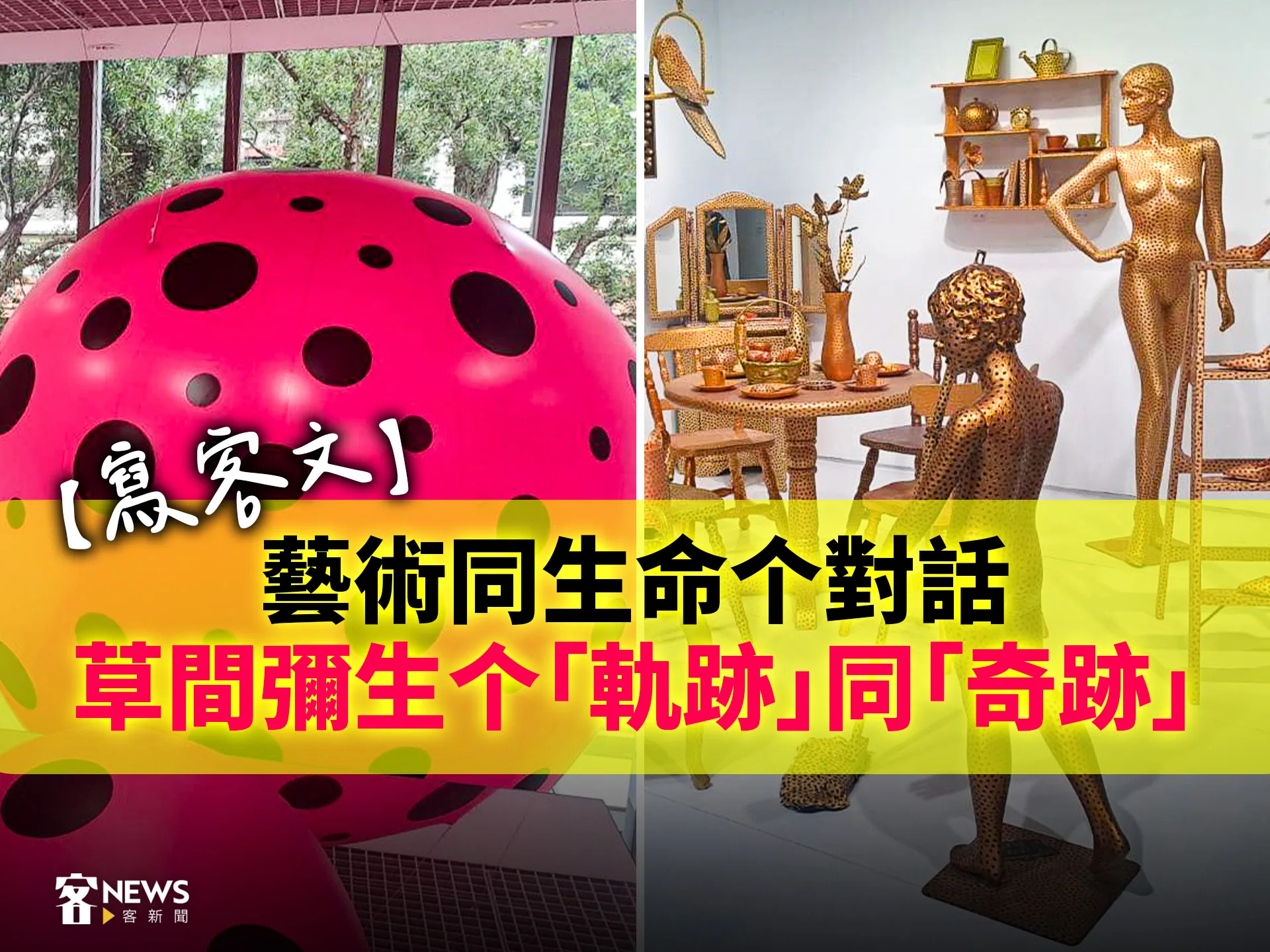 講著這個在當代藝術歷史項,最有代表性个藝術家——現下既經96歲个草間彌生,雖然頭擺係學習日本畫个訓練,但係佢嗄行出咧傳統个藝術形式,用自家个生命經驗,發展有厥特殊色目个藝術語言。厥作品除忒圖畫之外,還用咧拼貼、版畫、行為、展演、錄影同大型裝置這兜多元个方式,甚至𨃰領域去到時尚該條路,用花剌必駁个色水、大膽个創作,在世界這垤畫布項留下厥名。