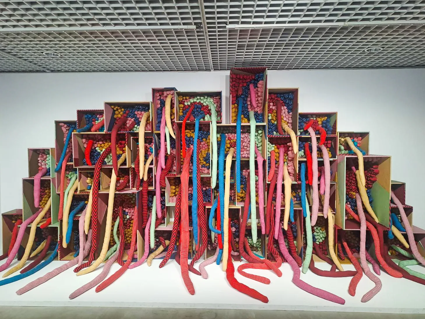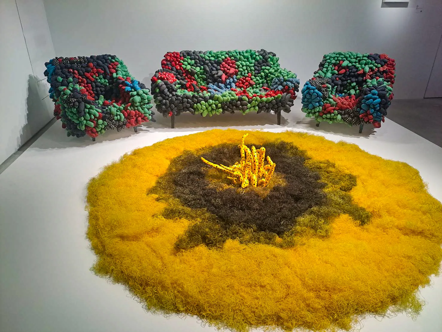 1985年後,一步一腳印登上世界舞台的草間彌生,開始揮別70年代的陰鬱,作品呈現生命力、放膽揮灑創作的能量,這些也能夠在「草間的綻放」展區中看見,如《夜晚的花瓣》、《夕照》、《草間的房間》錄像,還有軟雕塑裝置《永劫回歸》等。