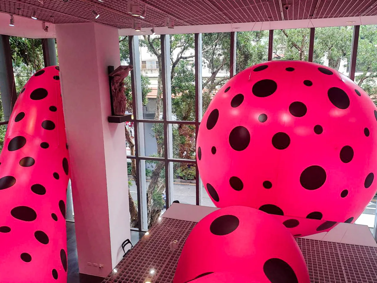 不過,講到這位偉大的藝術家與臺灣的緣分,就必須提到1998年,草間彌生受到當時臺北市立美術館館長——林曼麗與策展人——南條史生的邀請,在「臺北雙年展」創作大型裝置——《圓點的強迫妄想》,用七個帶有黑色圓點的螢光粉色汽球,佈滿北美館的中庭,這是草間彌生用大型雕塑與公共空間對話的重要節點;也是這次的展覽,讓臺灣與這位全球知名的藝術家有越來越多接觸。