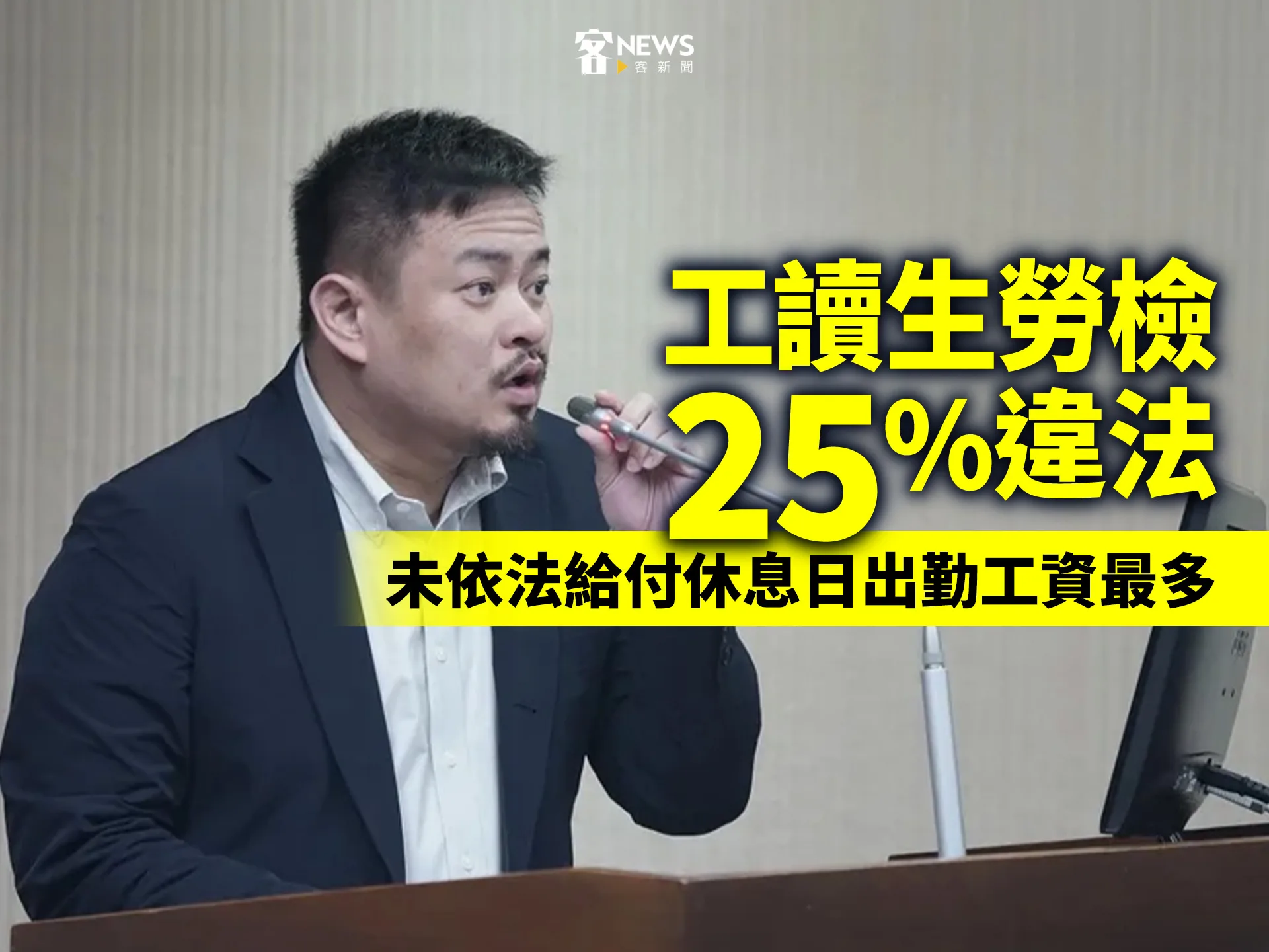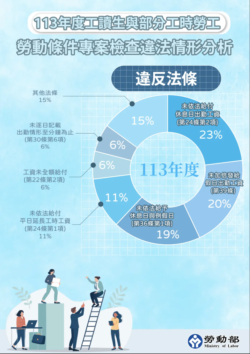 違法行業以餐館業48%占比最多。工讀生專案勞檢違法率24.89%,與全行業勞動條件檢查違法率18%至20%相比仍然偏高,後會持續關注並加強輔導查核。