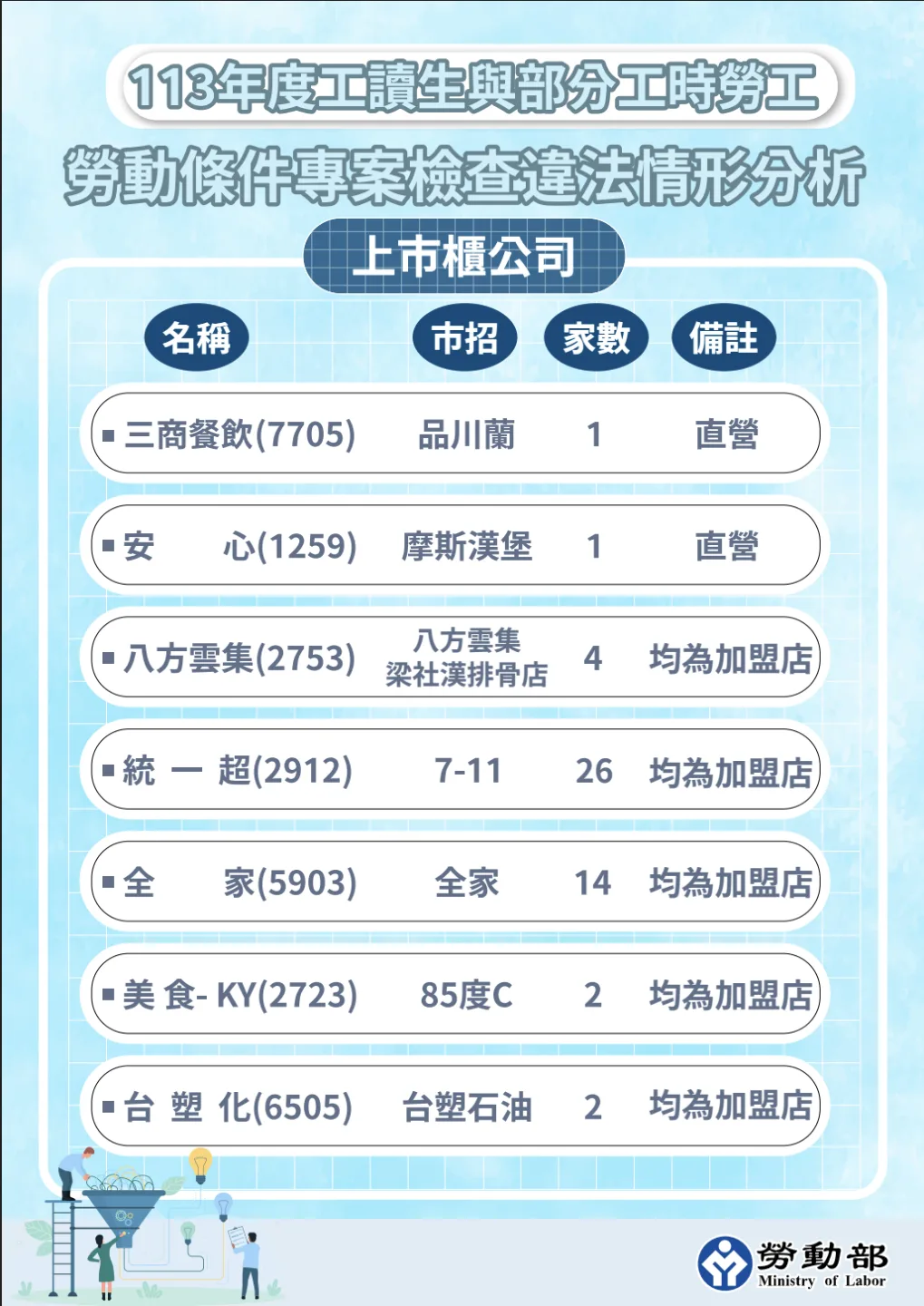 【生活中心/綜合報導】許多青年利用暑假打工,勞動部今天(1日)公布2024年工讀生勞檢結果,違法率24.89%,其中不乏知名企業。勞動部表示,勞檢完整的違規裁罰紀錄與詳細資訊,將彙整到勞動部網站和查詢系統,讓民眾公開查詢。今年將勞檢1800場次,違法企業也將列重點複檢對象。