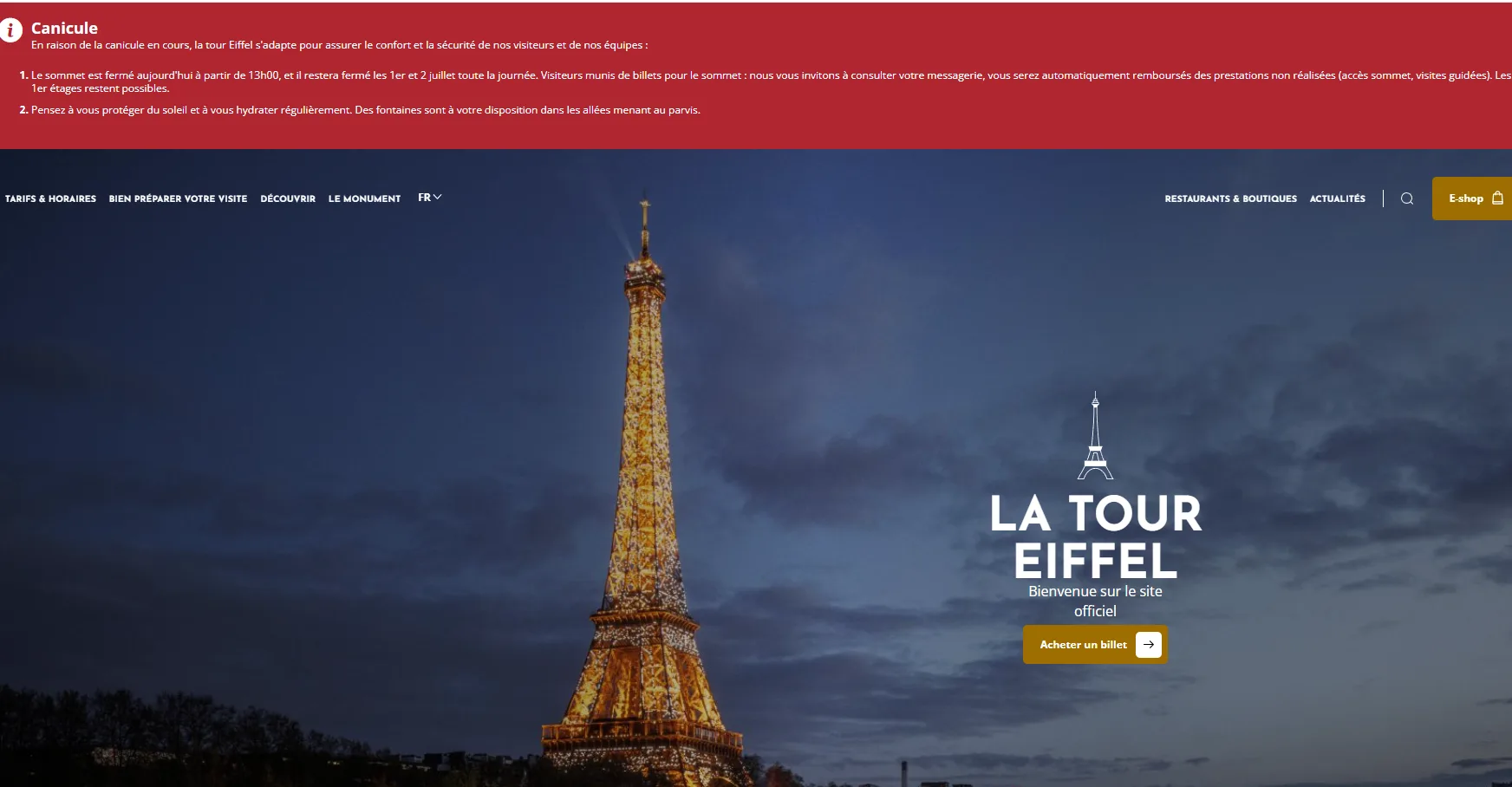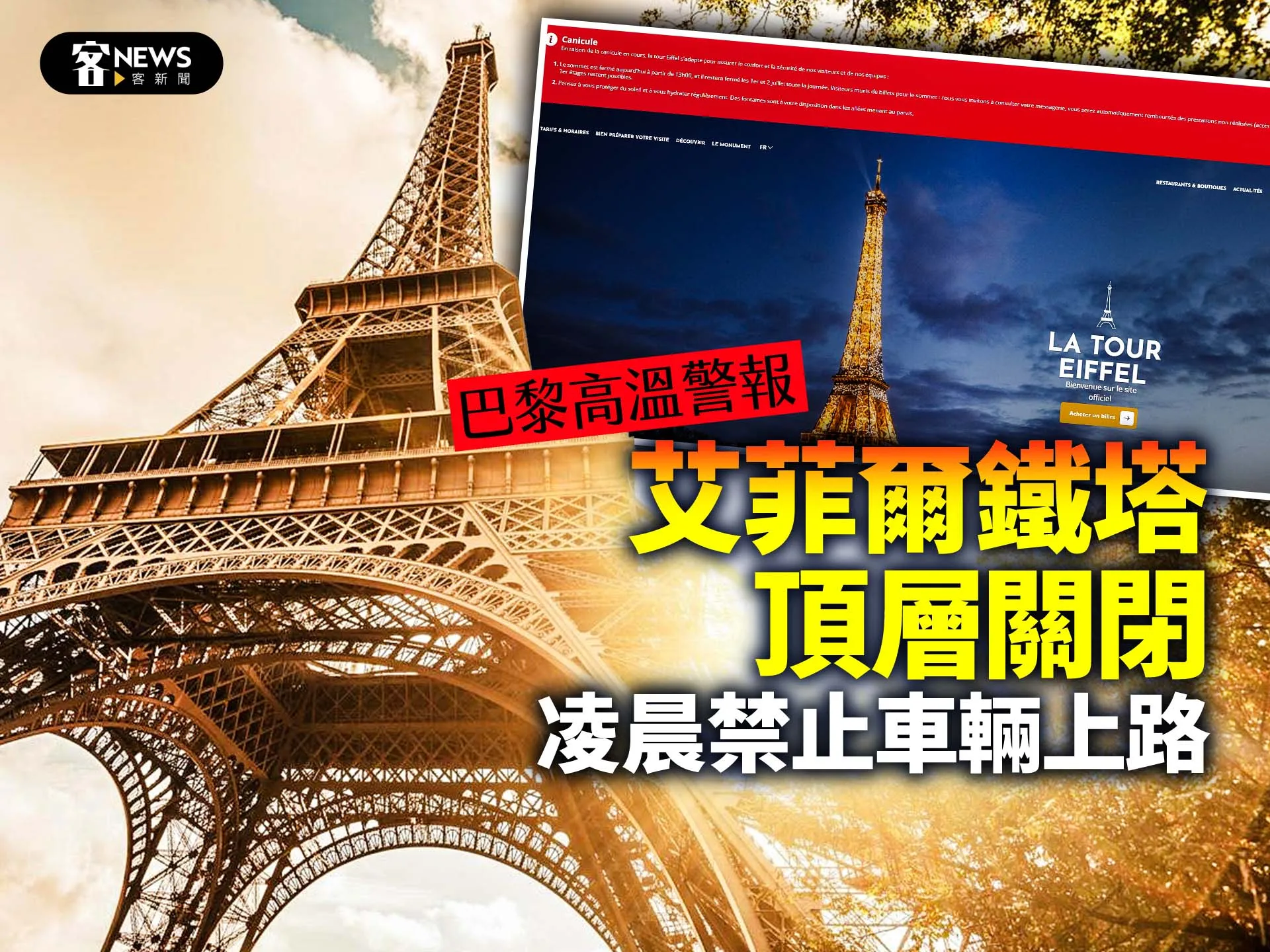 艾菲爾鐵塔營運商於昨天格林威治時間11時(台灣時間6月30日晚間7時)關閉鐵塔頂層,並「因當前熱浪」,今明兩天持續關閉。鐵塔第1層和第2層則維持開放,但營運商警告遊客仍須謹慎,應避免曝曬、多喝水。