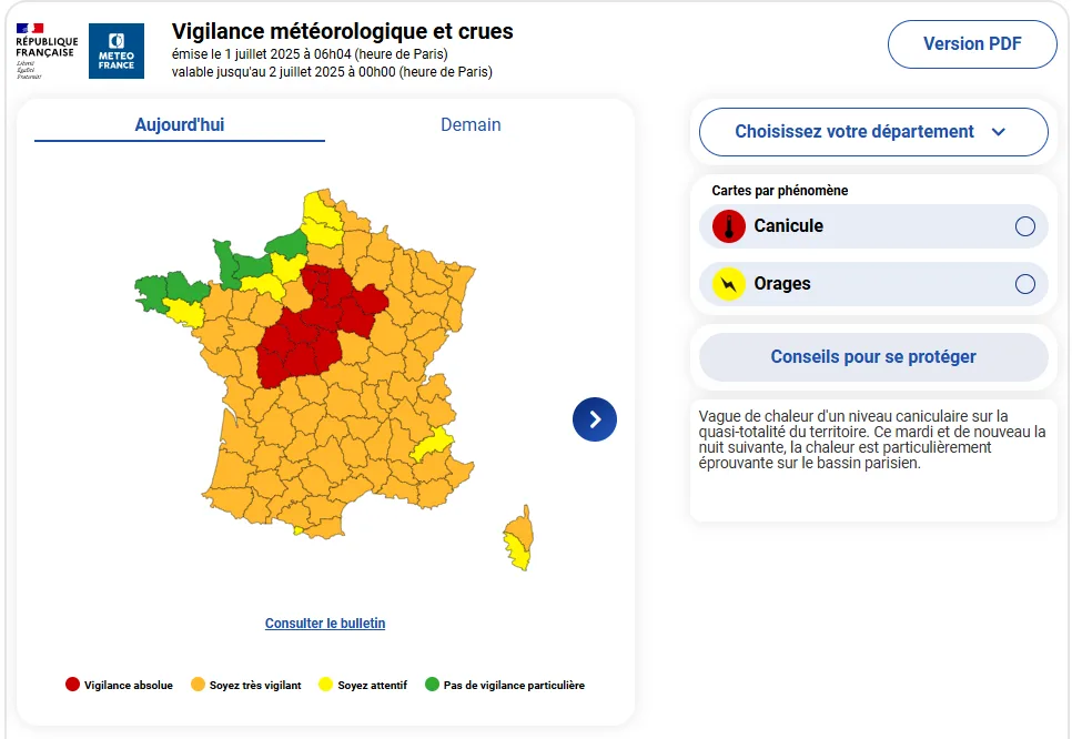 法國氣象局(Meteo France)預估國內氣溫今天將達到高峰,有16省發布最高等級的極端高溫警示,另有68省發布次一級警示。法國氣象局預估最低氣溫將達攝氏20度到24度,部分地區會更高一些,最高氣溫則將達36度到40度,甚至41度。