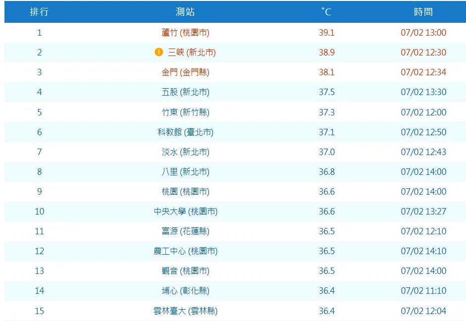 金門縣金城鎮38.1度、台北市士林區37.1度、新竹縣竹東鎮37.3度;苗栗、彰化、雲林、嘉義、台南、高雄、宜花東地區都出現36度多的高溫