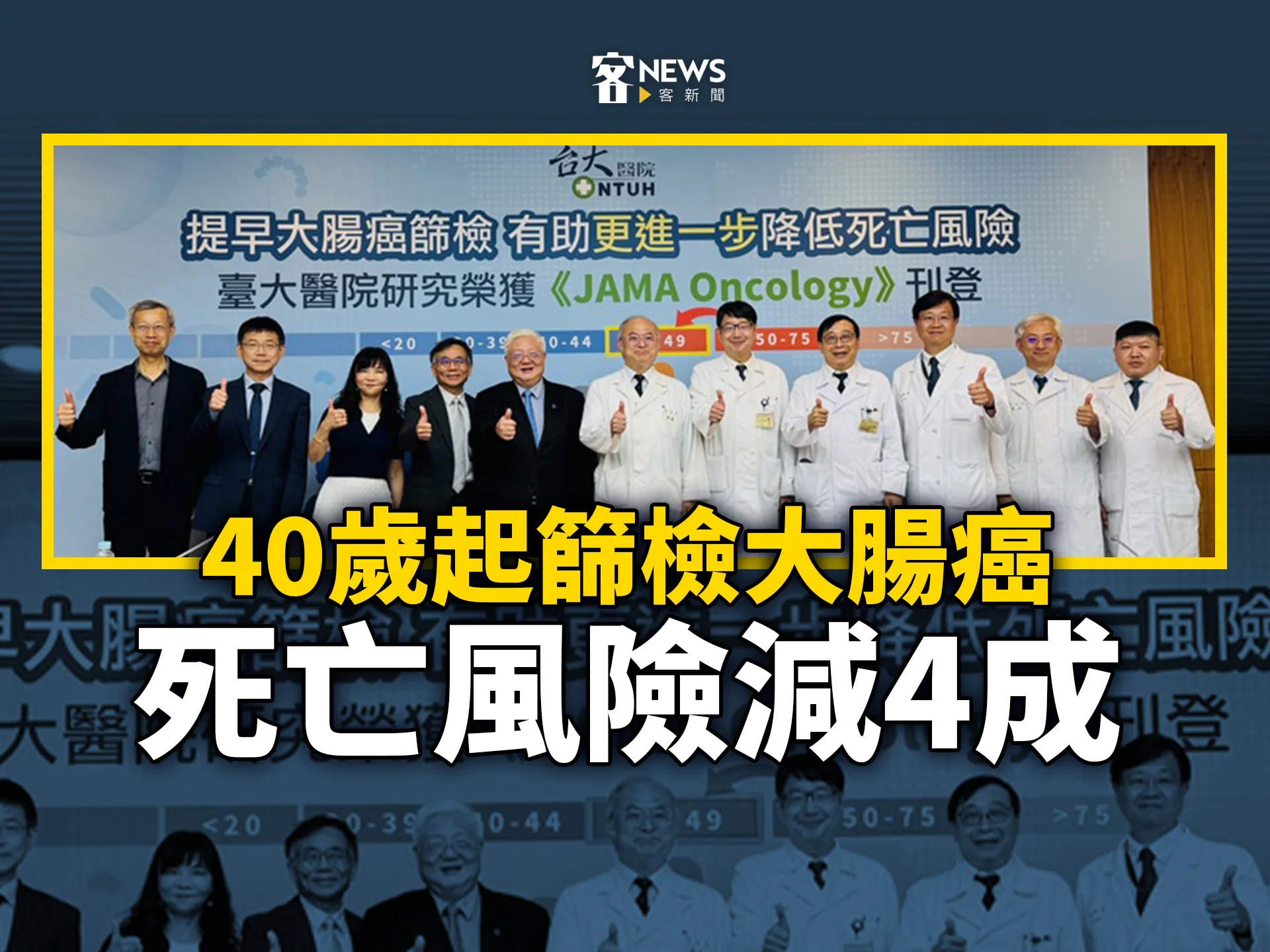 【生活中心/綜合報導】台大醫院團隊今天(3日)發表一項最新研究證實,大腸癌篩檢年齡從50歲提前到40歲,可顯著降低發生率21%至25%,死亡風險下降34%至39%。這項觀察性研究成果今年6月12日發表在國際權威期刊《JAMA Oncology》,成全球預防大腸癌提供關鍵實證依據。