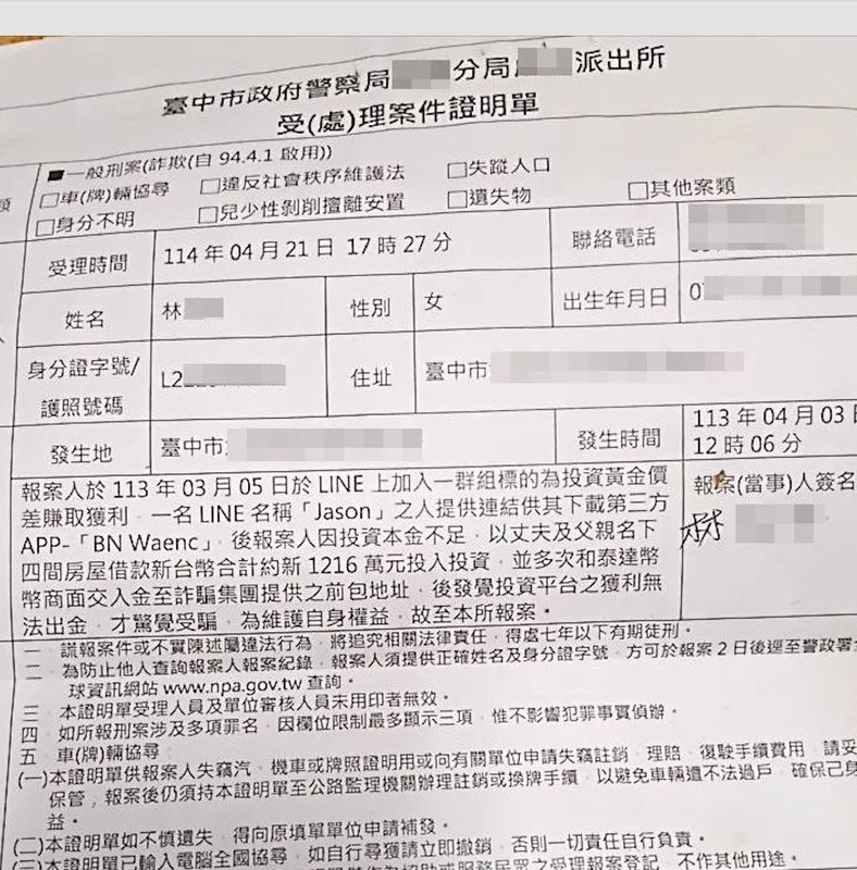 【江芮敏/苗栗市四縣腔】台中市1名林姓婦人疑陷「黃金投資」詐欺陷阱,2年內投入千萬元、貸款4間房產,出金時對方卻人間蒸發,父女背上逾3千萬元債務,每月被利息壓的喘不過氣,警方已成立專案小組追查。