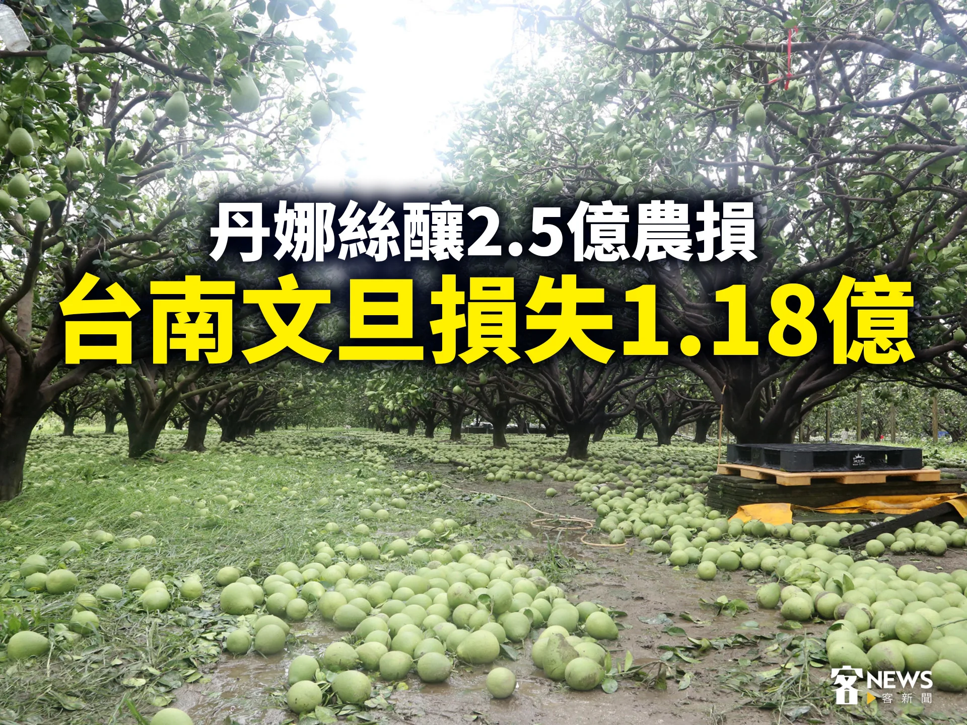 【生活中心/綜合報導】農業部今天(7日)統計,颱風「丹娜絲」造成的農業災情,估計損失新台幣2億5716萬元,各縣市災損以台南市約2.1億元最嚴重,全國損失中佔比82%。文旦柚為農作物受損之首、損失1.1億逾元,其餘前五大受損農作物依序為龍眼、椪柑、食用玉米和香蕉。