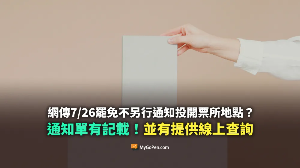 有關網傳「7/26 投票不會公布投票所」的傳言,MyGoPen 實際詢問中選會,中選會表示,此次投票通知單將與過去的選舉或是罷免案相同,通知單都會印有投票人姓名、投票人名冊號次、提票所別及地點、投票種類、戶籍地址等資訊。