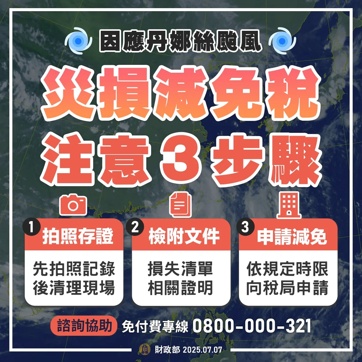 【生活中心/綜合報導】因應丹娜絲颱風造成中南部各地的災損,提醒若有因颱風淹水等災害而有財產損失的民眾,要記得先拍照存證,並於災害發生後30天內,到財政部稅務入口網或各縣市稅務局官網,點擊線上服務/申辦及下載,申報(請)稅捐減免。