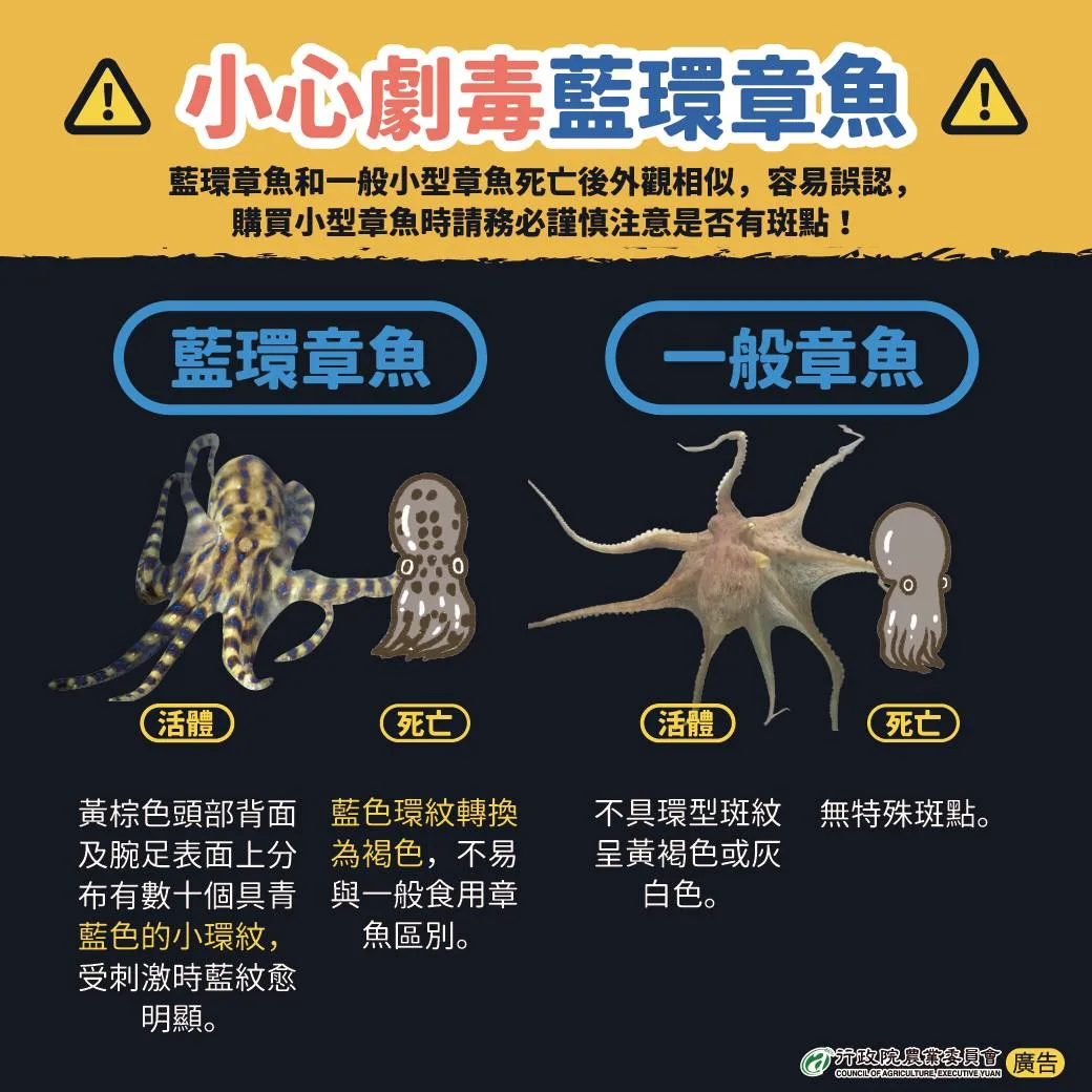 農業部識教大家仰般分辨做得食个一般八爪魚摎有毒个藍環八爪魚,在該買細條个八爪魚該下,愛特別驚心敢有攞著帶有花紋个八爪魚。