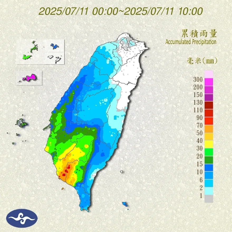 氣象署表示,今天上午持續受低壓帶影響,環境仍偏西南風,易有短延時強降雨,金門縣、高雄市、屏東縣有局部大雨或豪雨發生的機率;彰化至台南地區,有局部大雨發生的機率,要注意雷擊及強陣風。今天午後,宜花地區有午後雷陣雨,太平洋高壓逐漸增強,風向漸轉偏南風,主要低層水氣也漸移往中國沿海,預計晚起水氣減少,降雨也逐漸緩和。