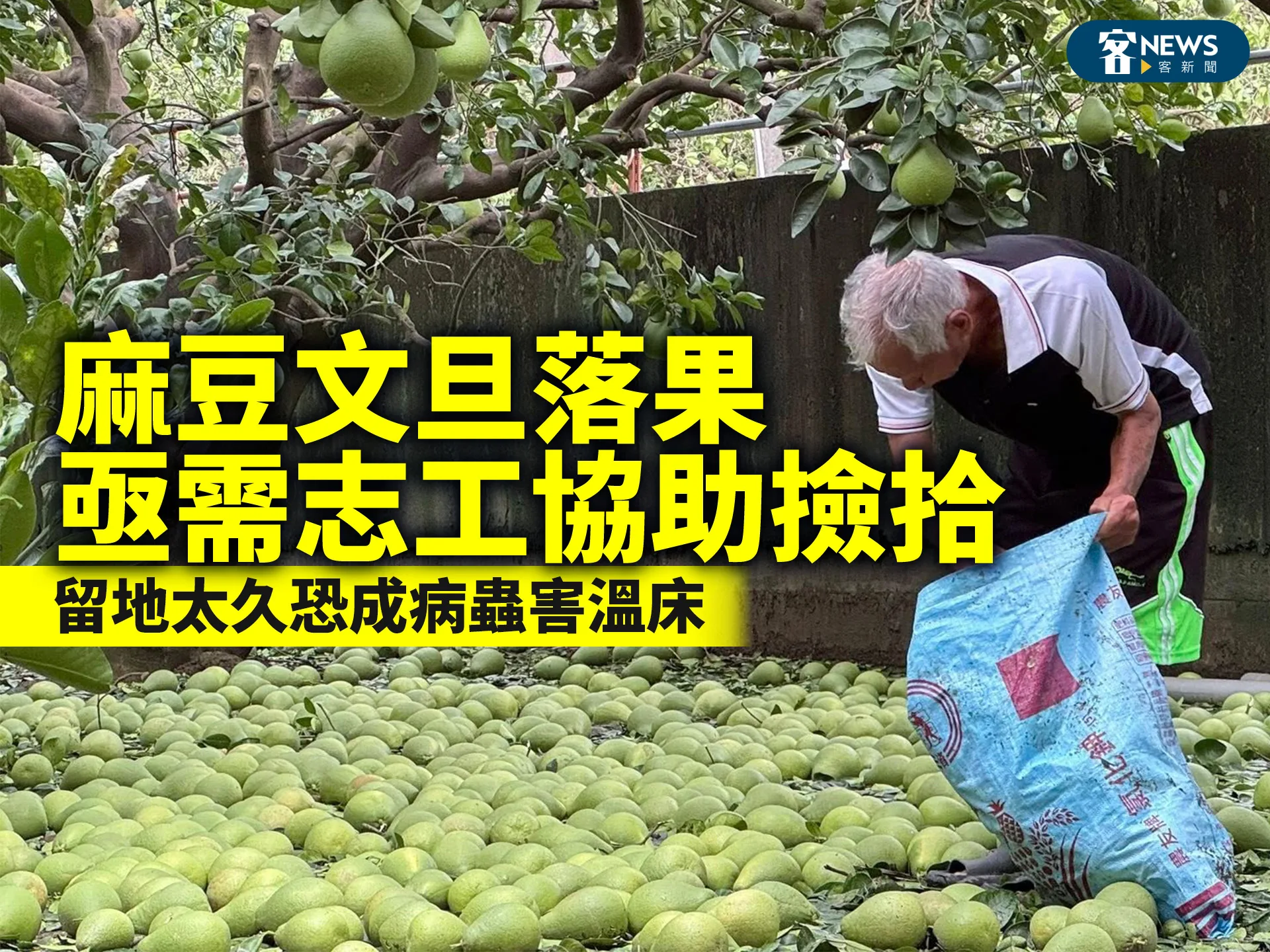 目前麻豆災區雖有國軍人力協助,可是因為文旦柚落果數量真的太多,儘管大家已經努力撿了2、3天,落果依舊很多,由於柚農大多上了年紀,動作不快,這幾天麻豆地區又持續下大雨,雨後高溫讓果農十分擔憂,如果有志工願意協助柚農撿果,請自備雨鞋,打電話給麻豆區農會推廣部陳宜珮(06) 5722-007 #262,他們會幫忙媒和。