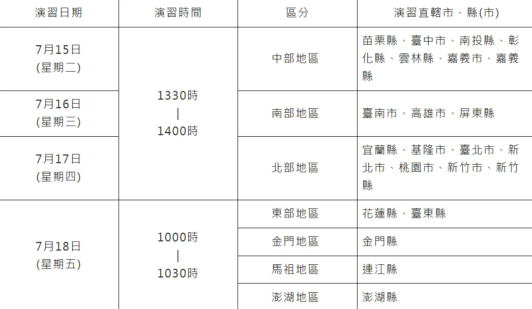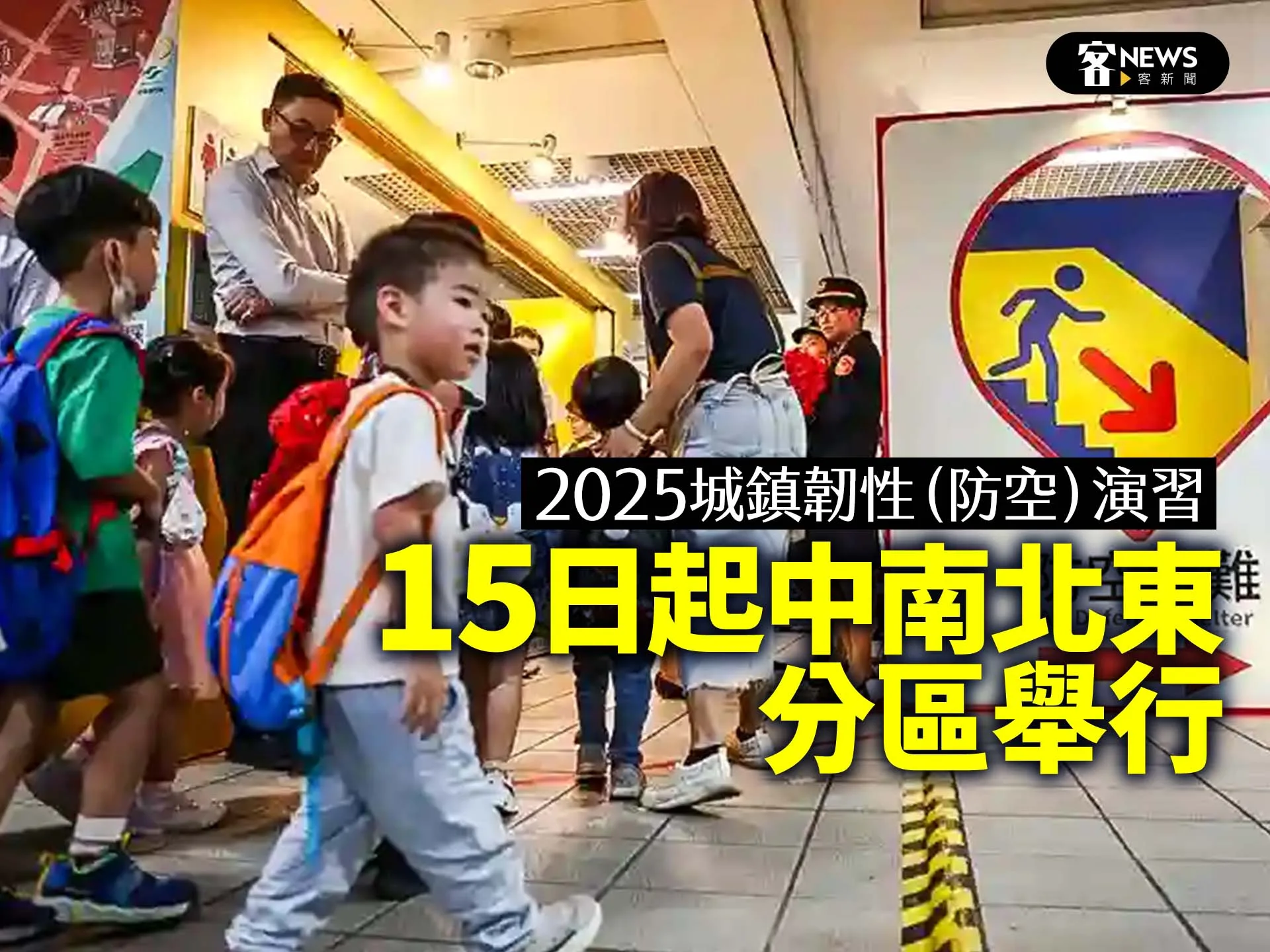 【要聞中心/綜合報導】國防部全民防衛動員署指出,「2025城鎮韌性(防空)演習」將從本月15日起,分北中南東及離島四天舉行,15日最先登場的是苗栗縣、台中市、南投縣、彰化縣,當天下午1點30分到2點。國防部將於13:30發送空中威脅告警系統簡訊通知,警報開始:1長音15秒 ➝ 2短音各5秒(每段間隔5秒),共115秒;14:00再發送解除訊息,警報解除的音符是1長音90秒。