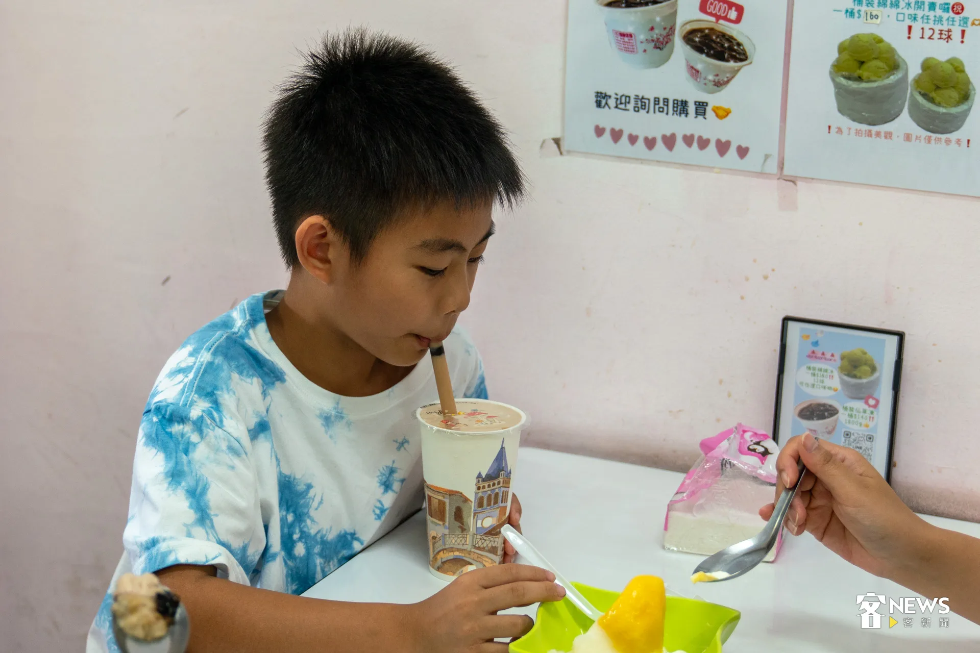 坐在一旁的鄧小姐母親推薦「仙草冰」,她還特別外帶好幾桶仙草凍,要送給住在高雄的親家。鄧小姐的孩子則推薦「漂浮紅茶加珍珠,」「還有芒果口味綿綿冰,很好吃、很香,每次來都會點。」
