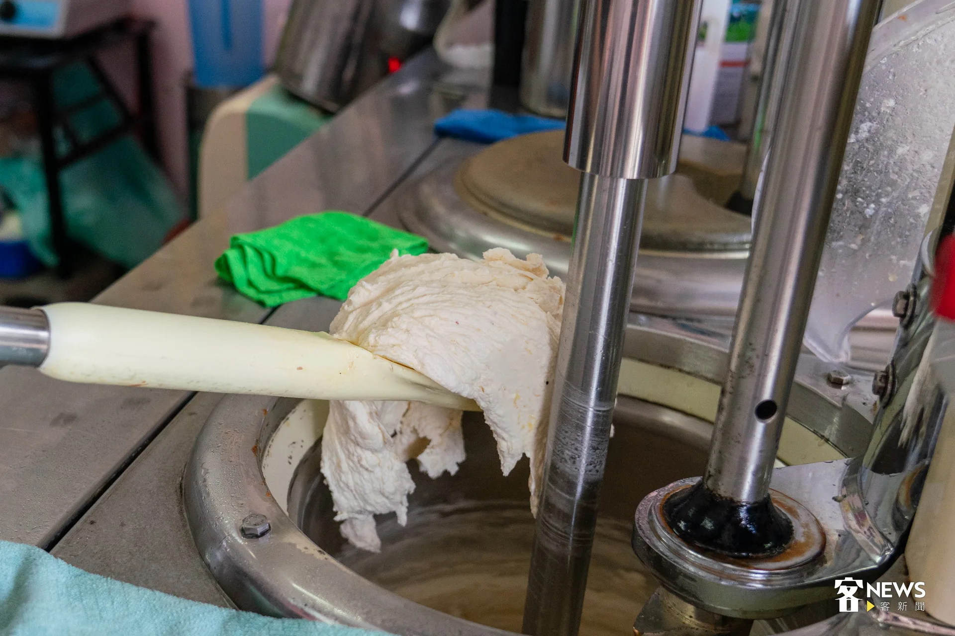 攪拌機泡在冷凍液裡,製冰過程約需15到20分鐘。許家翔手握長棒,頂住攪拌機的旋轉力道說:「要是沒握穩,棍子會被帶走,這一定要靠技巧鏟起來。」看似簡單的動作,全靠多年經驗累積。