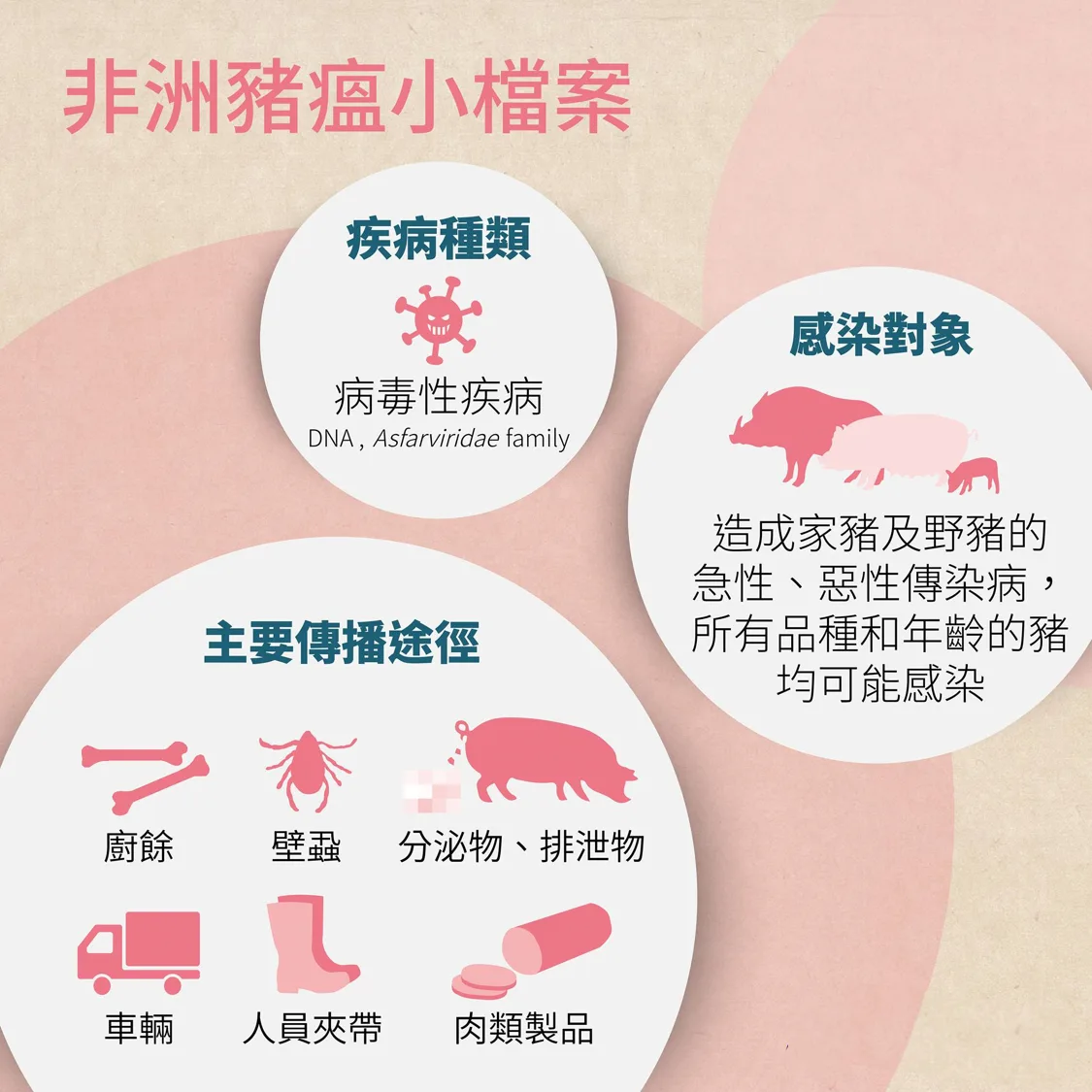 中華民國農業部个資料顯示,非洲豬瘟急性型个死亡率高達100%,雖然人毋會遰著,毋過無預防射做得預防,淨做得靠撲殺、掩埋或者化製處理病死豬,防止病毒遰開來,對產業造成嚴重个威脅。
