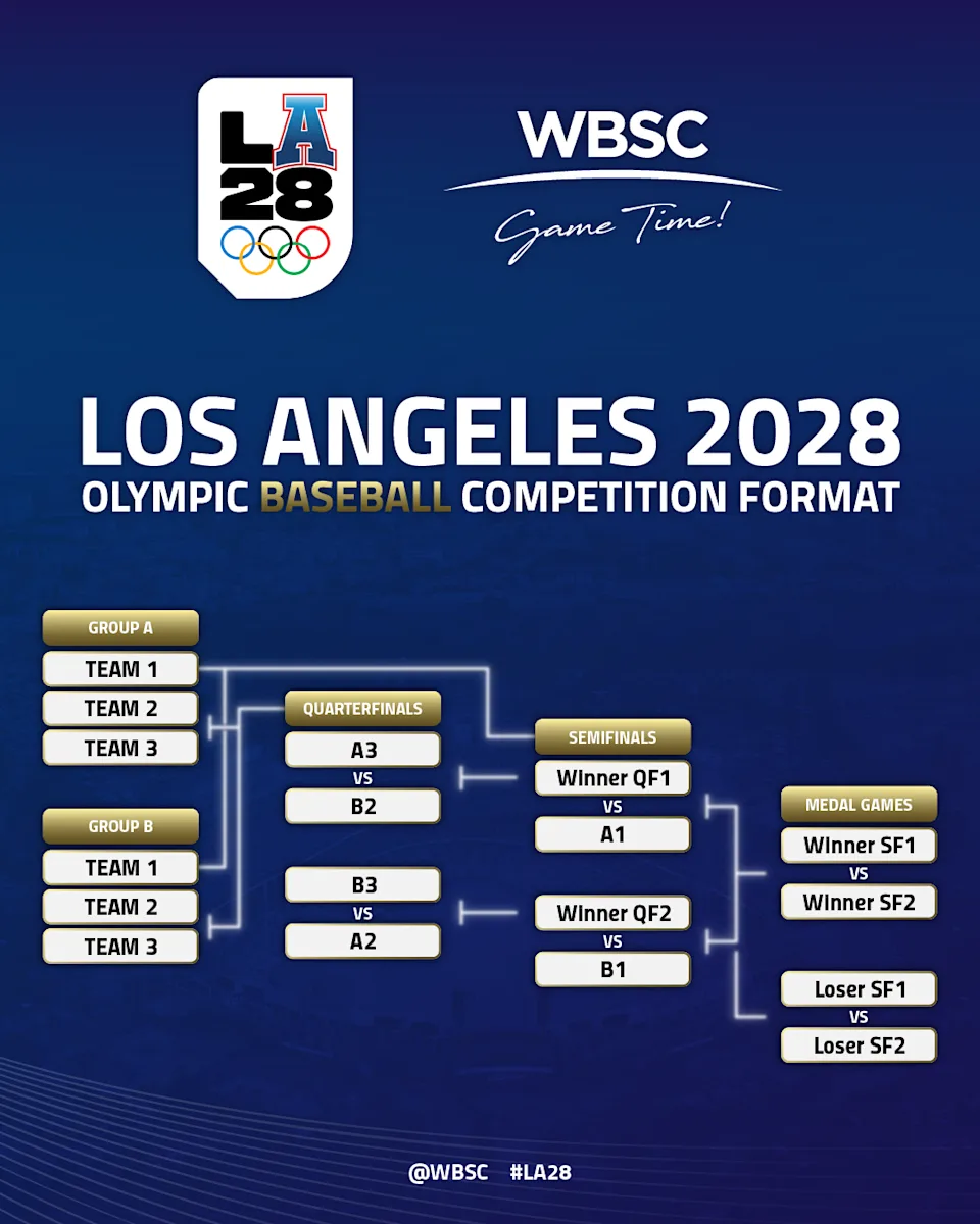 棒球項目安排於2028年7月15日至20日,在洛杉磯道奇球場舉行,預計會有6支球隊分為A、B組,角逐奧運第七面棒球金牌,目前地主美國確定佔有一席。