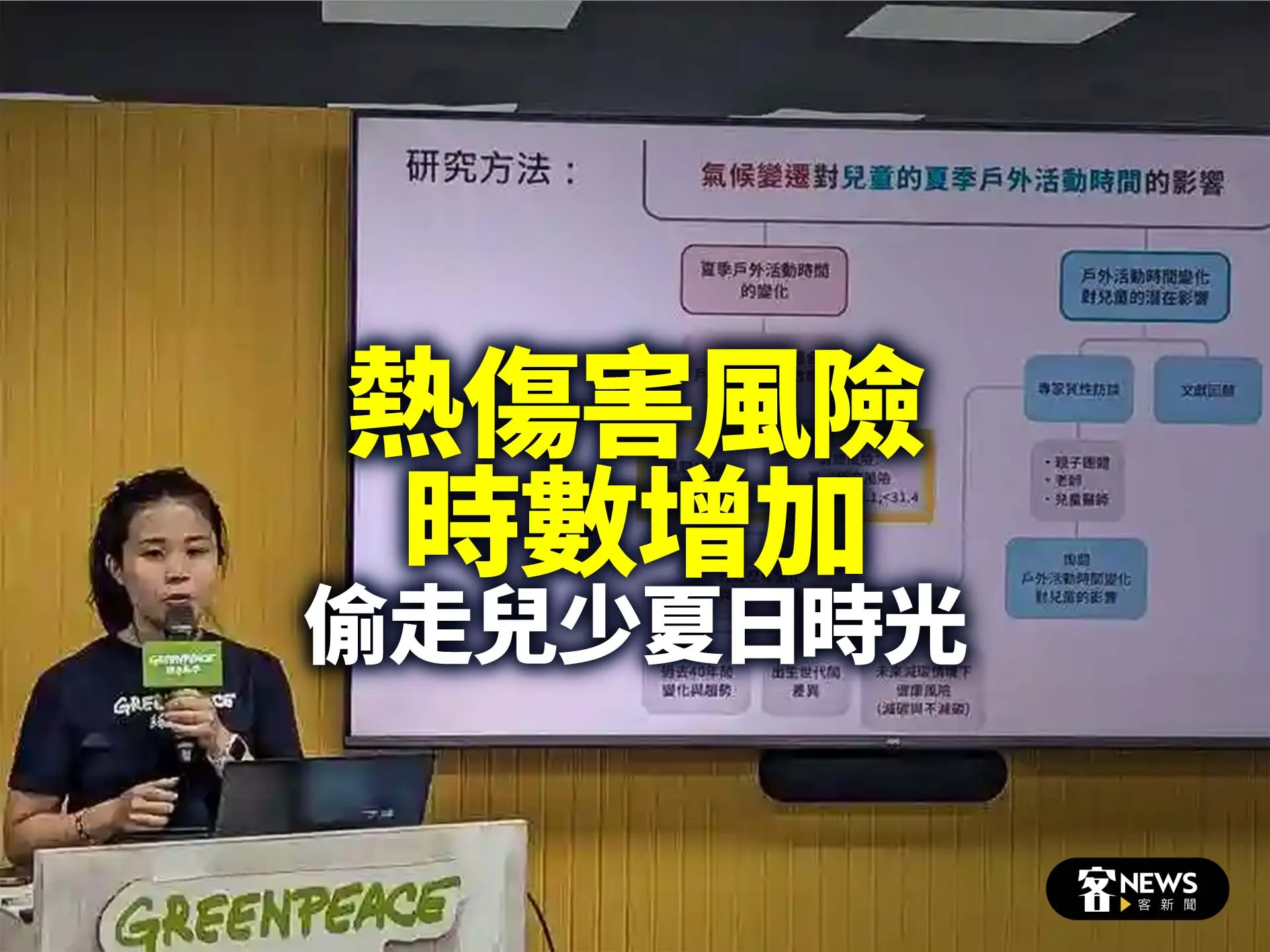 【生活中心/綜合報導】近年全球高溫屢創新紀錄,台灣近10年來的7月都出現極端高溫。綠色和平今天(15日)發表「被高溫偷走的童年:氣候變遷對兒童夏季戶外活動影響分析」報告,研究顯示2023年雙北等8縣市,夏天的熱傷害風險時數共約780小時,2100年更上看1193小時,影響兒少戶外活動權益。