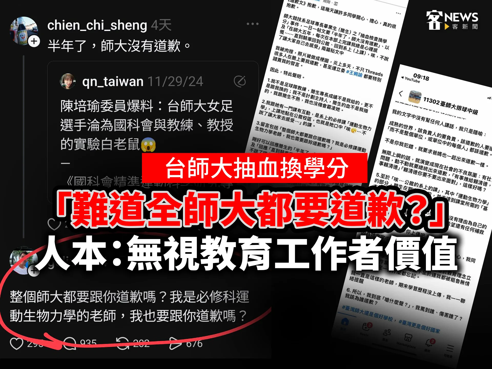 【生活中心/綜合報導】國立台灣師範大學「女足抽血換學分」爭議,台師大女足教練周台英遭質疑霸凌,不過該校運動競技學系副教授劉錦璋留言嗆「難道全師大都要道歉?」引發社會嘩然,人本教育基金會執行長馮喬蘭今天貼出劉錦璋的回應,質疑劉錦璋曲解被害學生、護衛校方,不僅是道德瑕疵,也忽略教育工作者應展現的價值、倫理及職業尊嚴。