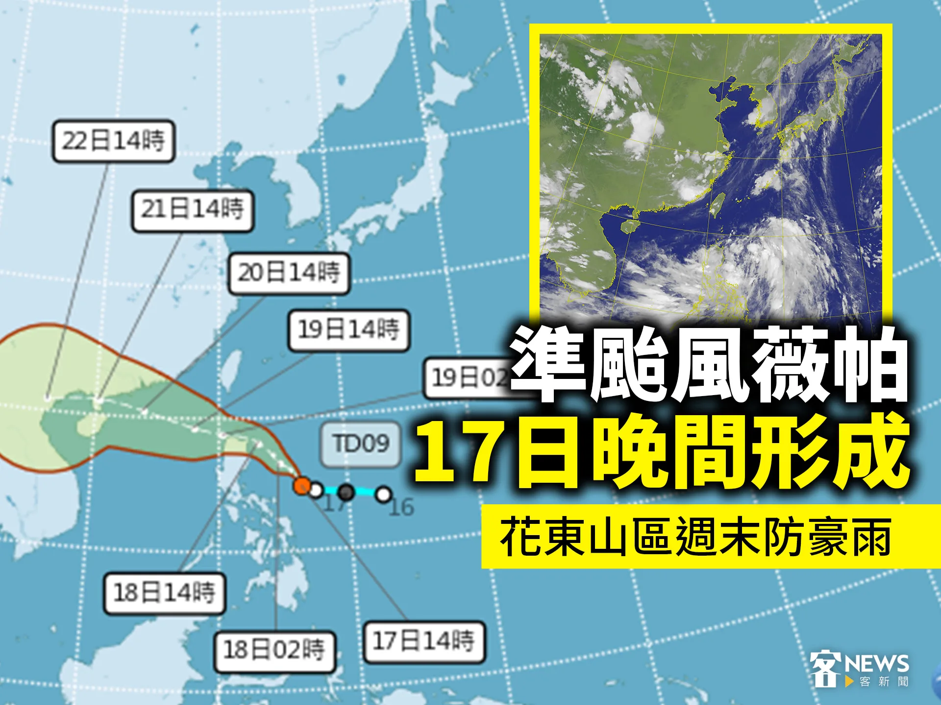 【生活中心/綜合報導】中央氣象署表示,準颱風薇帕最快今晚(17日)形成,預估發布海上颱風警報機會低,但其外圍環流挾帶大量水氣,明天起,台灣地區東半部、恆春半島將有陣雨或雷雨,花東山區週末要慎防豪雨等級以上的降雨。