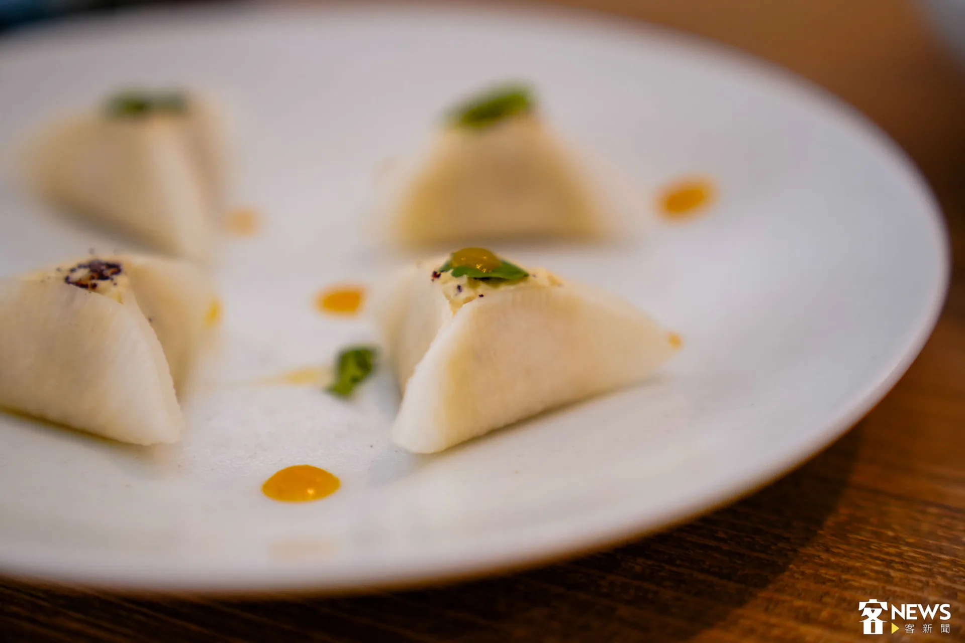 范佐銘說,「擂茶蘿蔔餃子佐桔醬」雖然看起來像水晶餃,但一口咬下,酥脆的口感、桔醬的香味,加上內餡的客家擂茶餅乾,讓他回味無窮,「當生趣」。今天三道菜中,這道讓他印象最深刻,事後還特別請問林莉,如何把不易塑形的白蘿蔔片做成三角型;林莉說,先切成薄片後,用少許鹽搓揉一下,硬脆的蘿蔔片就會變軟、容易塑形。