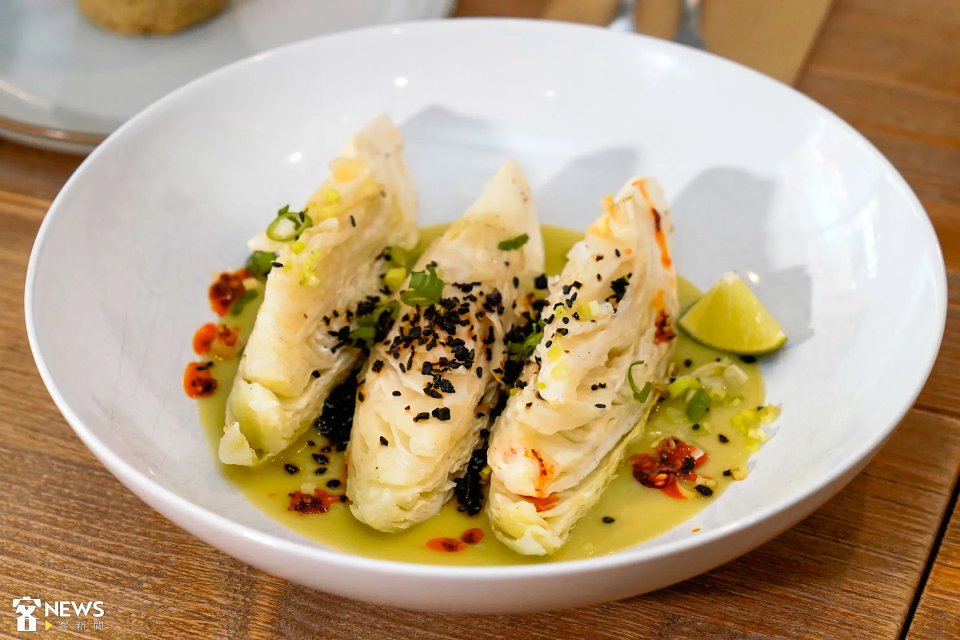 至於「烤白菜佐香蔥醬與老菜脯」,林莉說,她用整顆白菜去烤,加上青蔥醬汁,上菜時,將白菜切開,淋上醬汁及客家老菜脯、再滴上一點辣油。