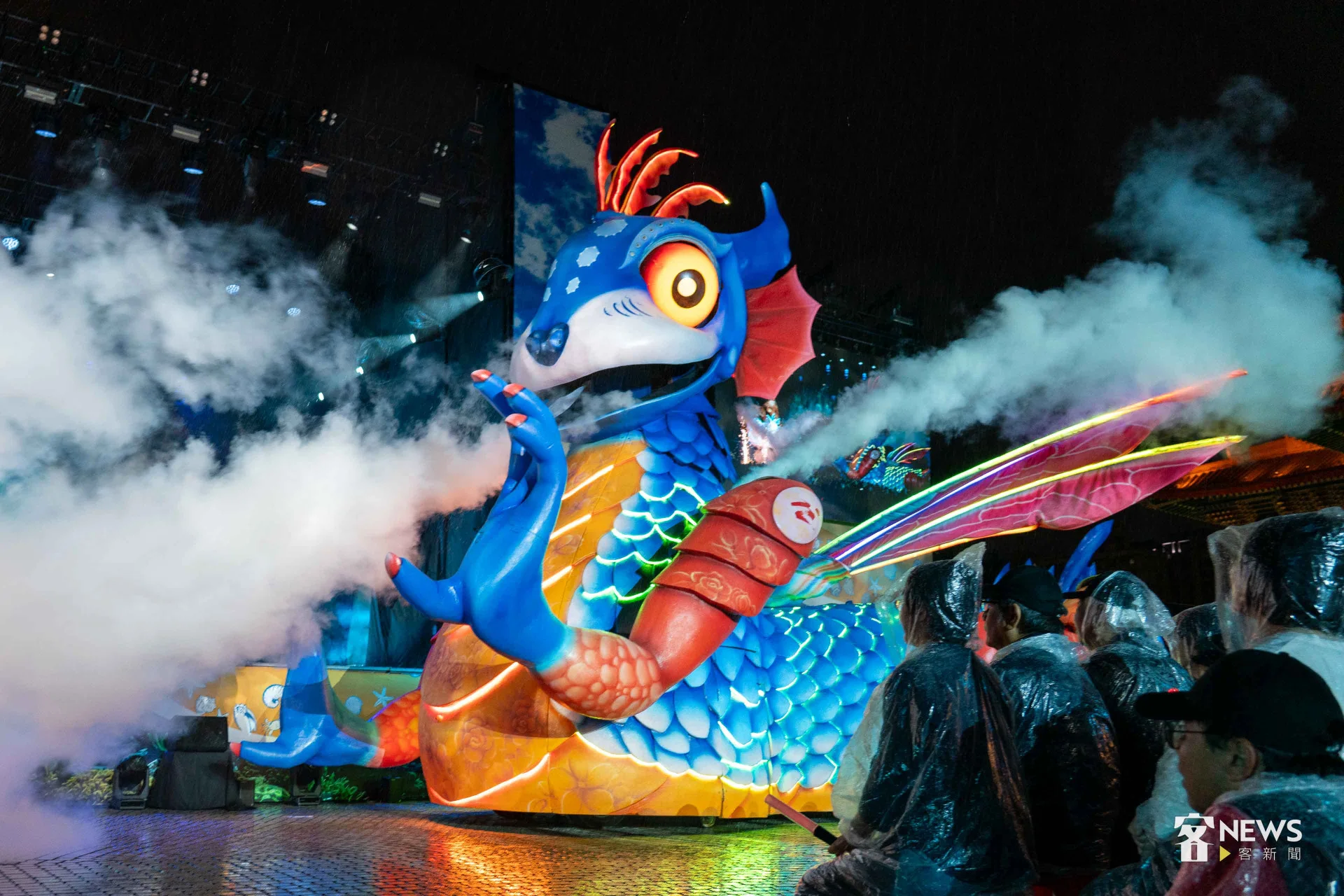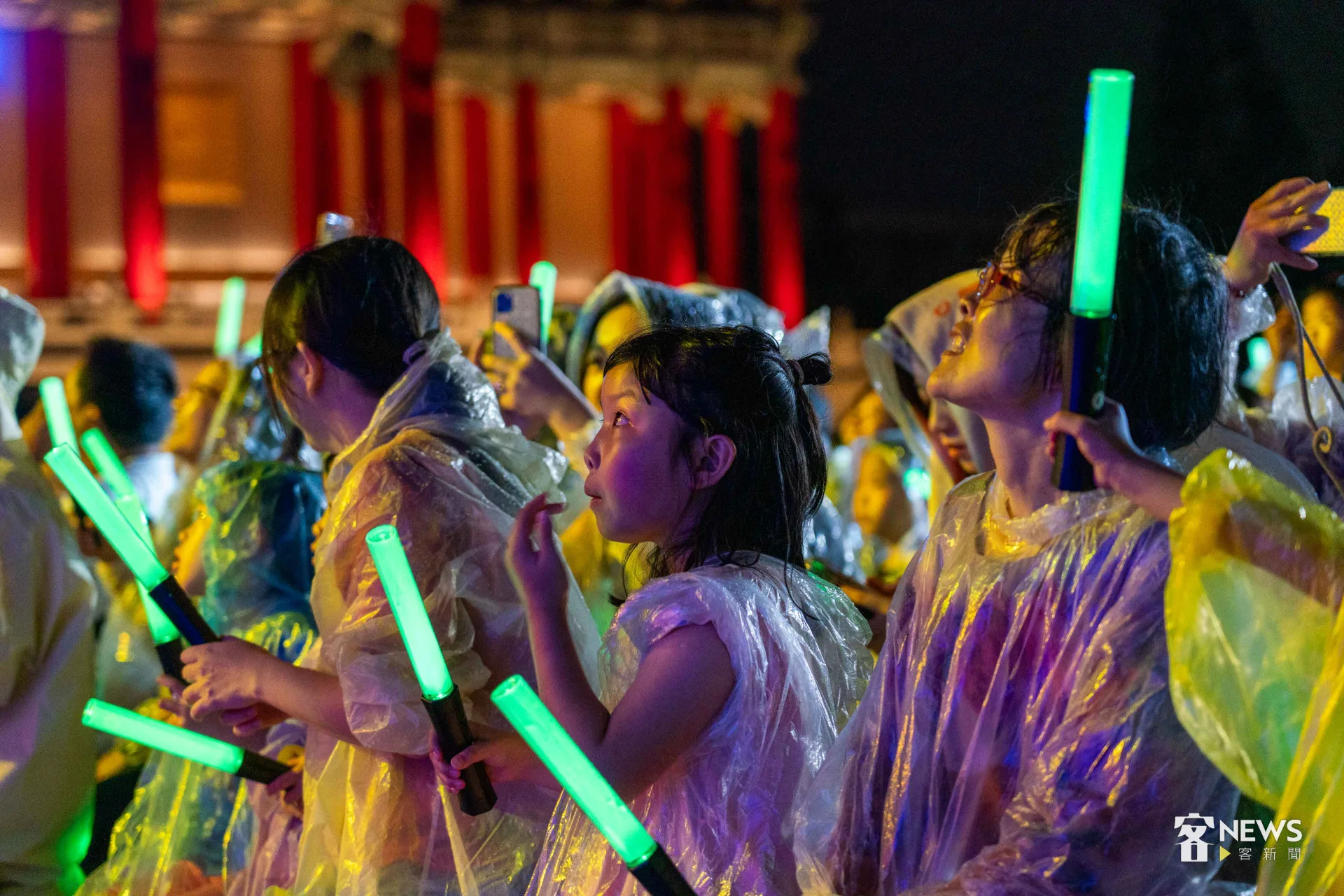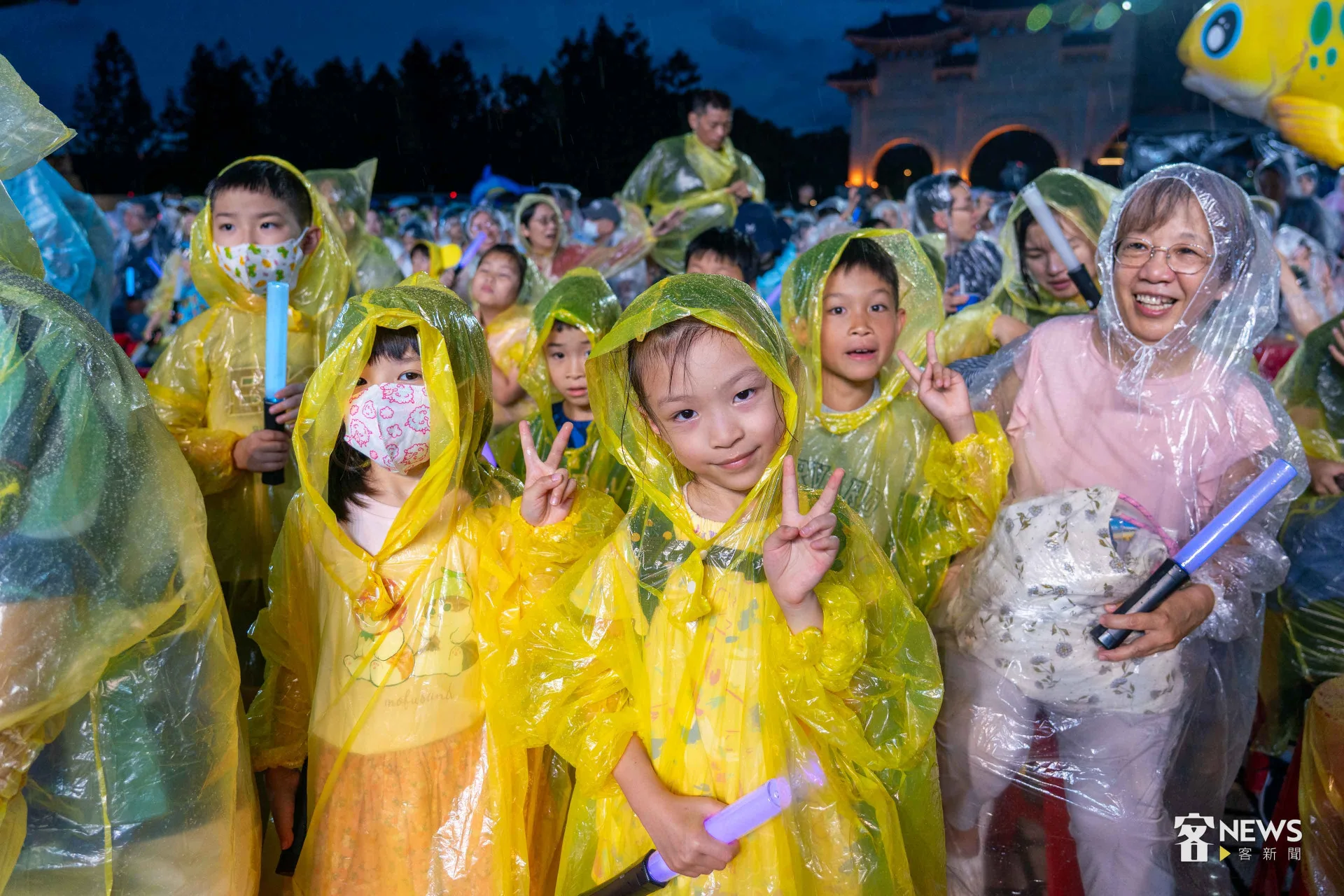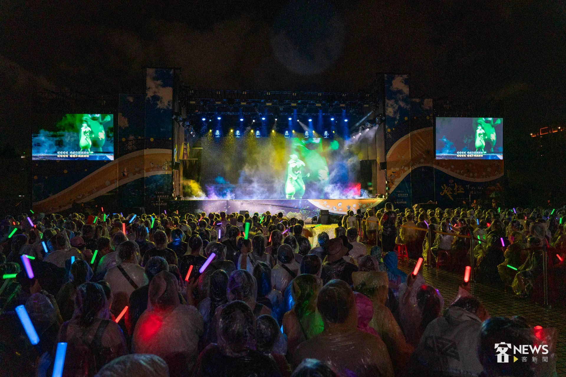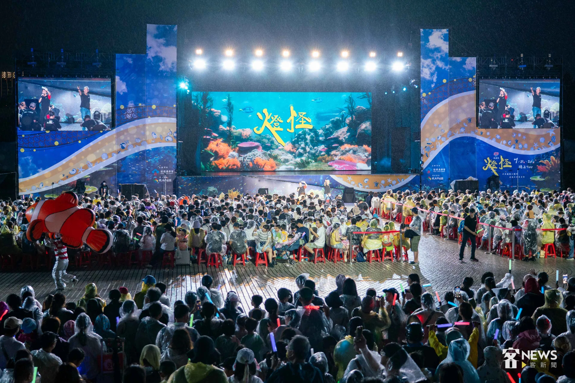 《燈怪》是客委會及紙風車劇團共同打造時尚又創新的客家親子劇,用童趣的寓言故事,傳達客家文化敬天惜物、尊重自然的「永續」精神。今天下午開始,台北市就開始下起一陣一陣的雨,但傍晚6點多,現場3千個座位已經8成滿;7點開演後,雨勢漸大,每個人穿起現場發放的透明雨衣,雨勢伴隨演出,一點都不減現場民眾興致。