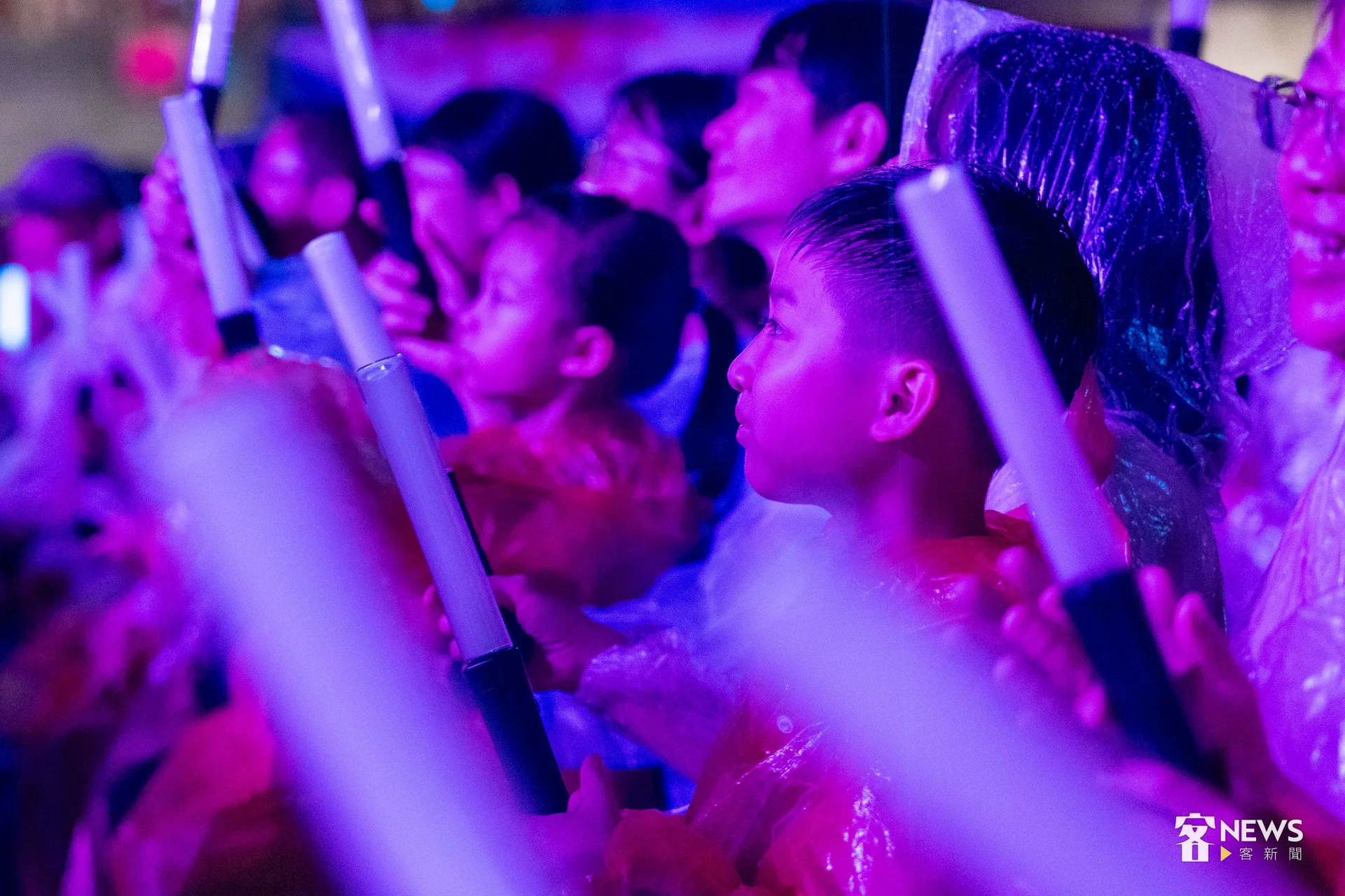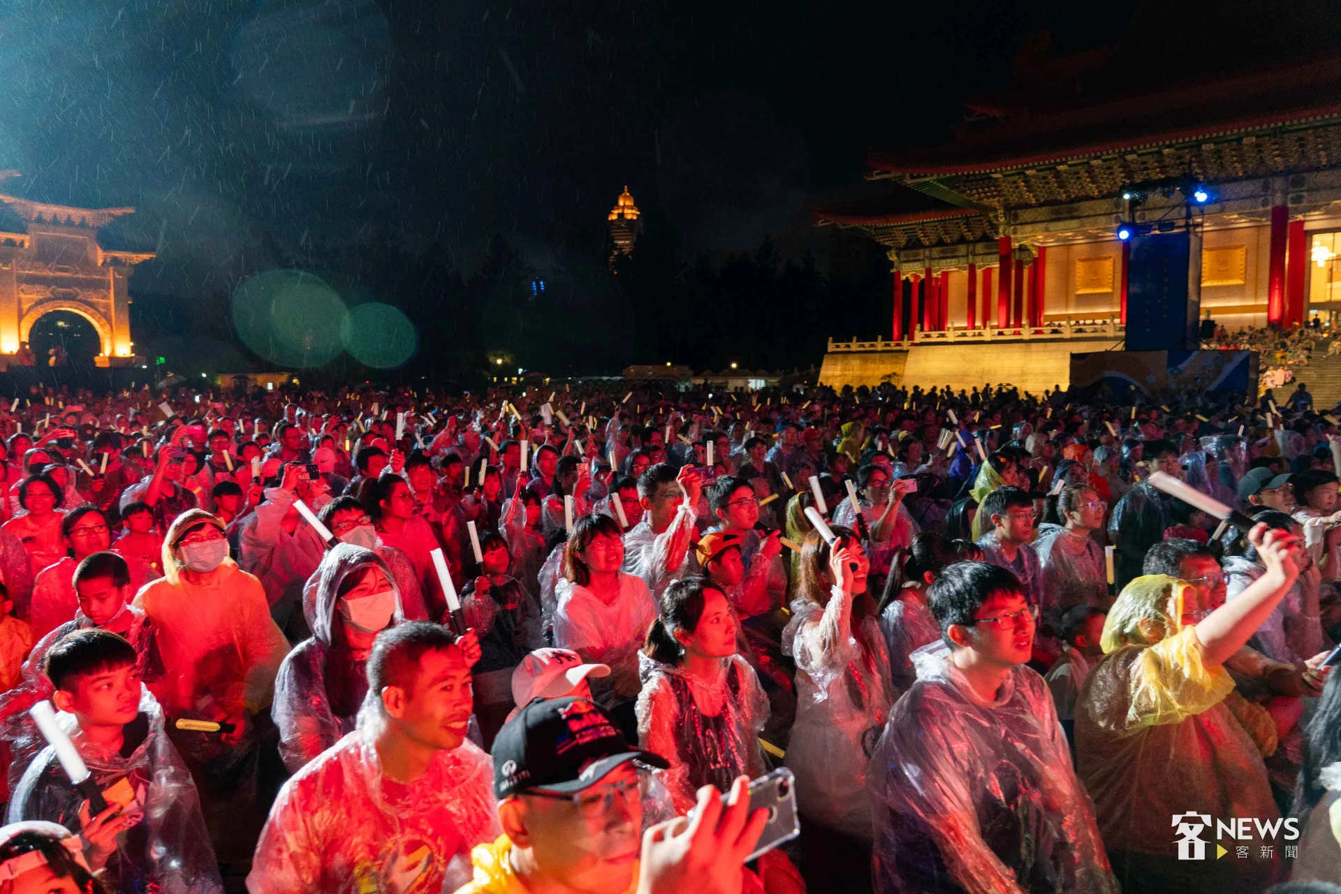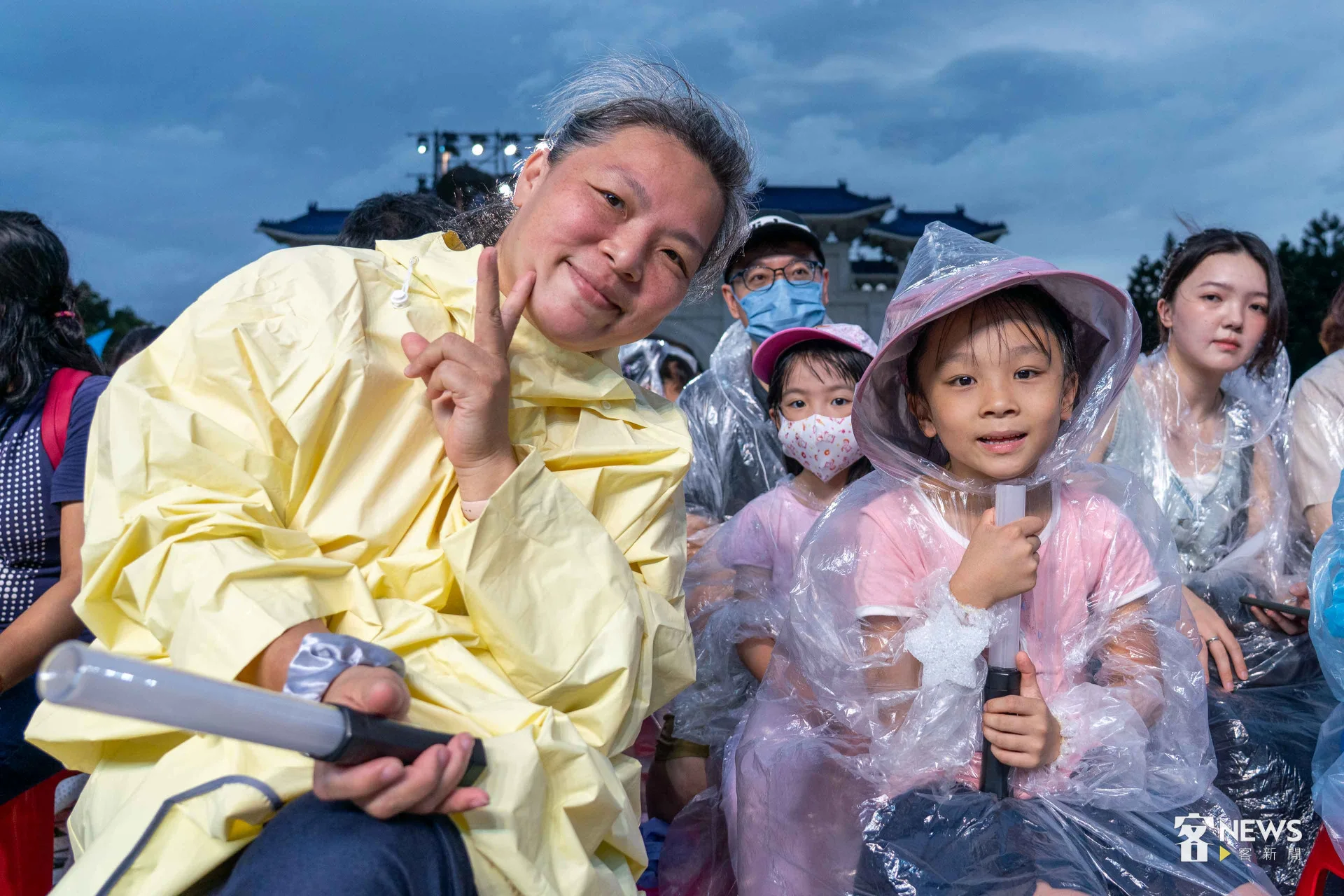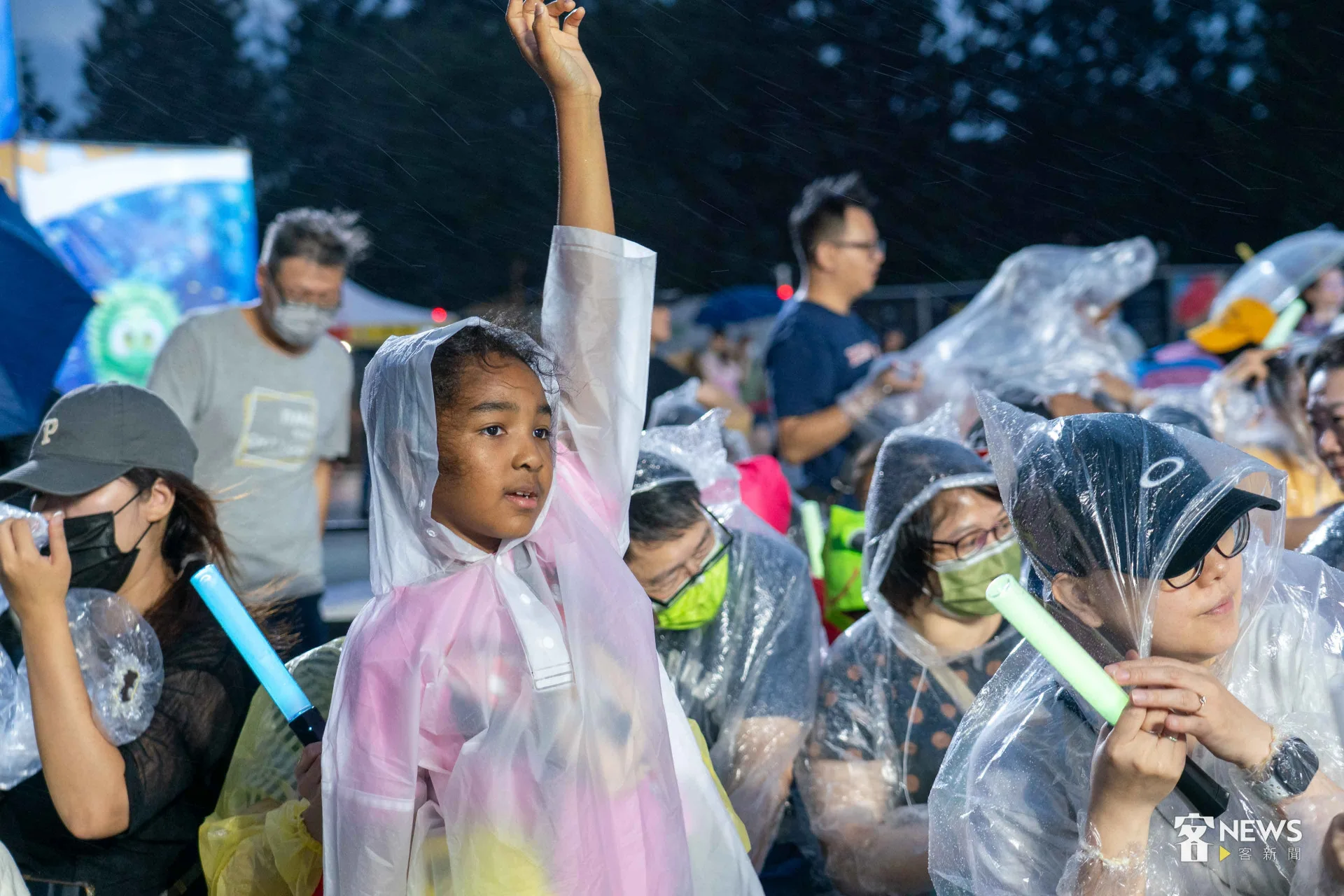 《燈怪》是客委會及紙風車劇團共同打造時尚又創新的客家親子劇,用童趣的寓言故事,傳達客家文化敬天惜物、尊重自然的「永續」精神。今天下午開始,台北市就開始下起一陣一陣的雨,但傍晚6點多,現場3千個座位已經8成滿;7點開演後,雨勢漸大,每個人穿起現場發放的透明雨衣,雨勢伴隨演出,一點都不減現場民眾興致。