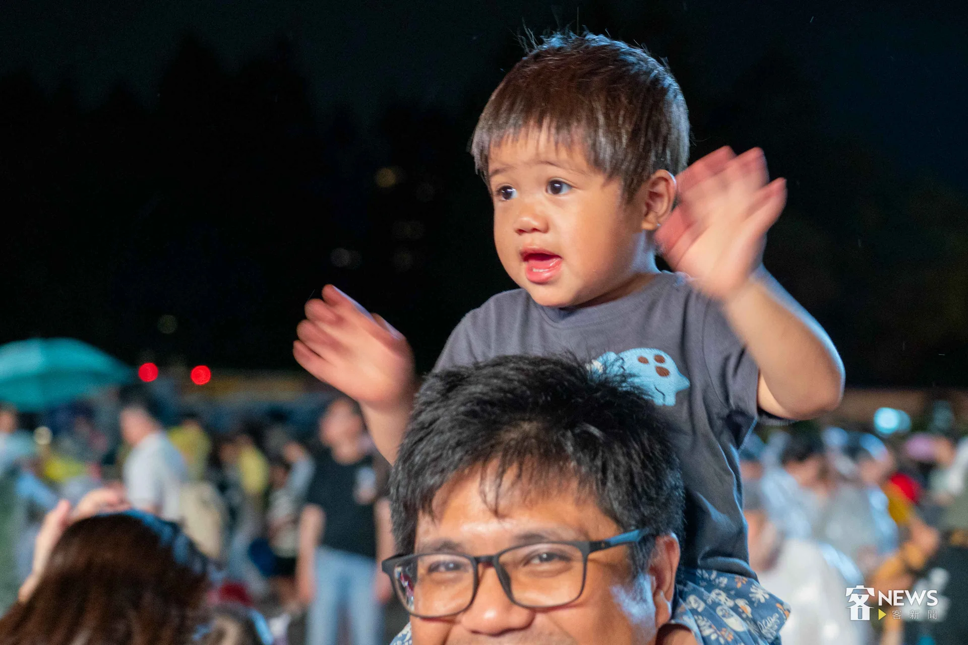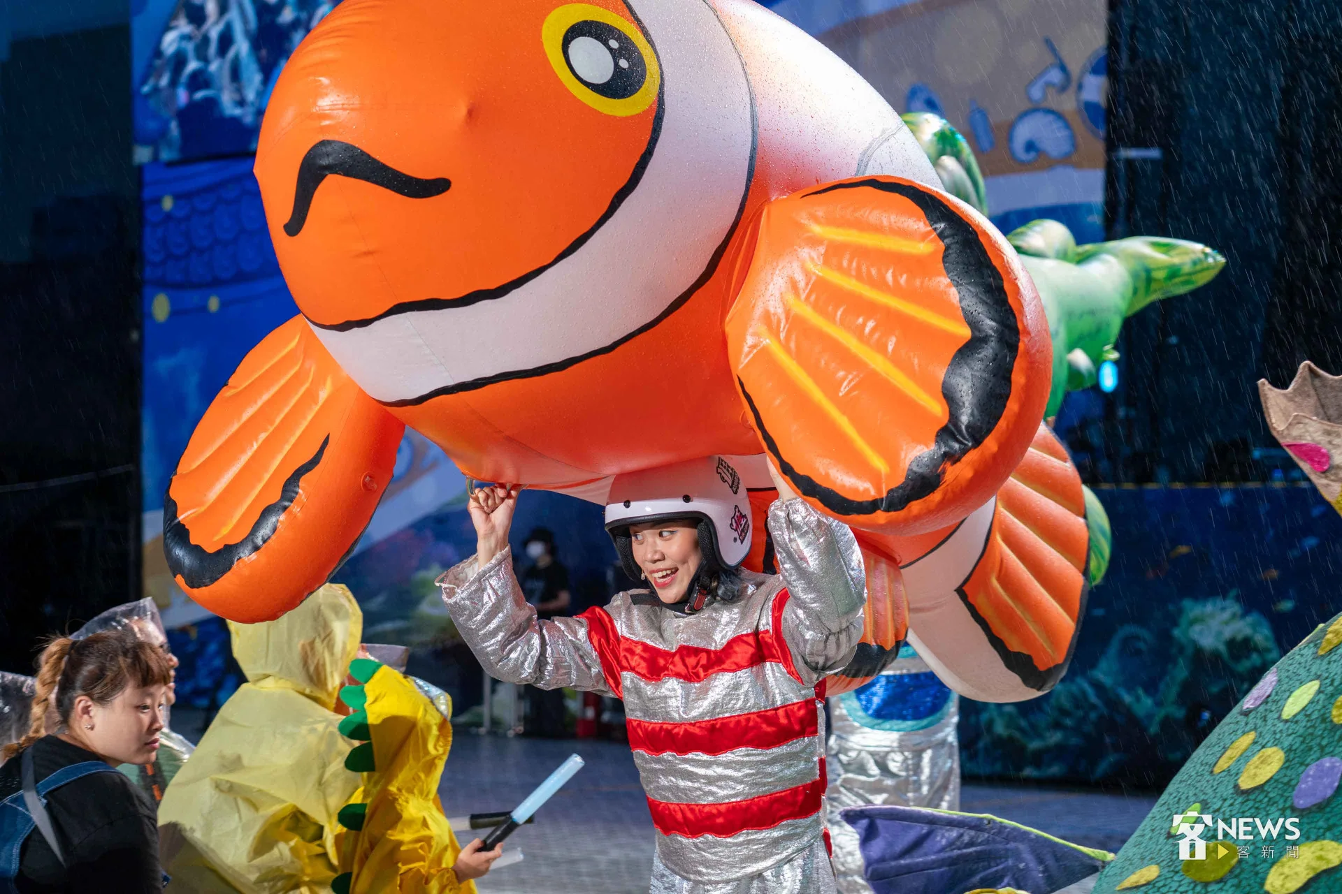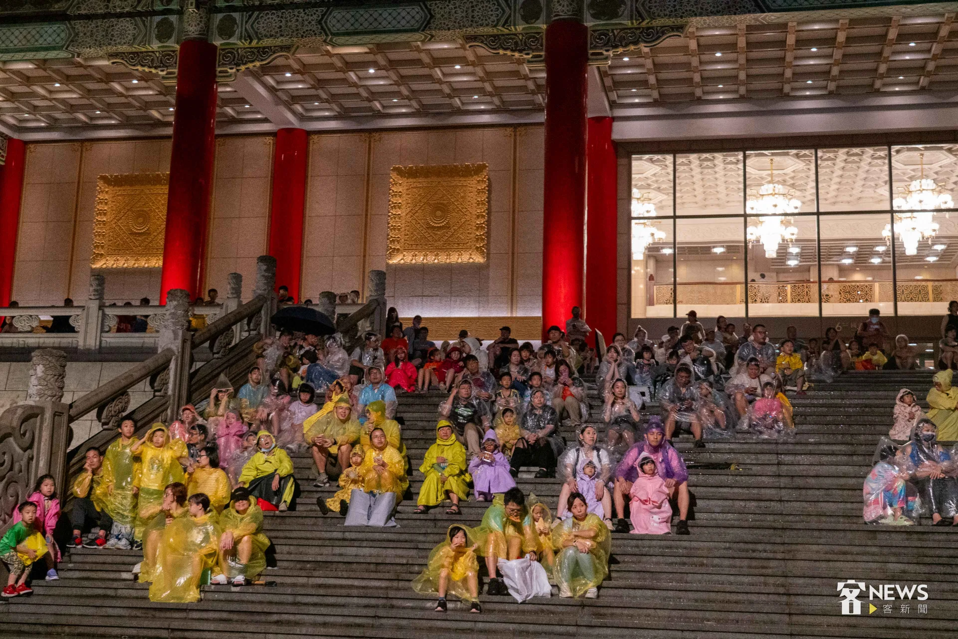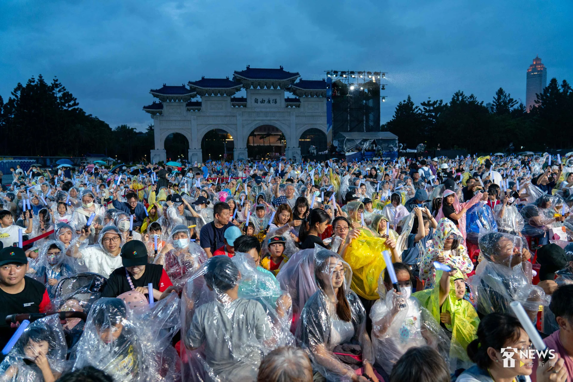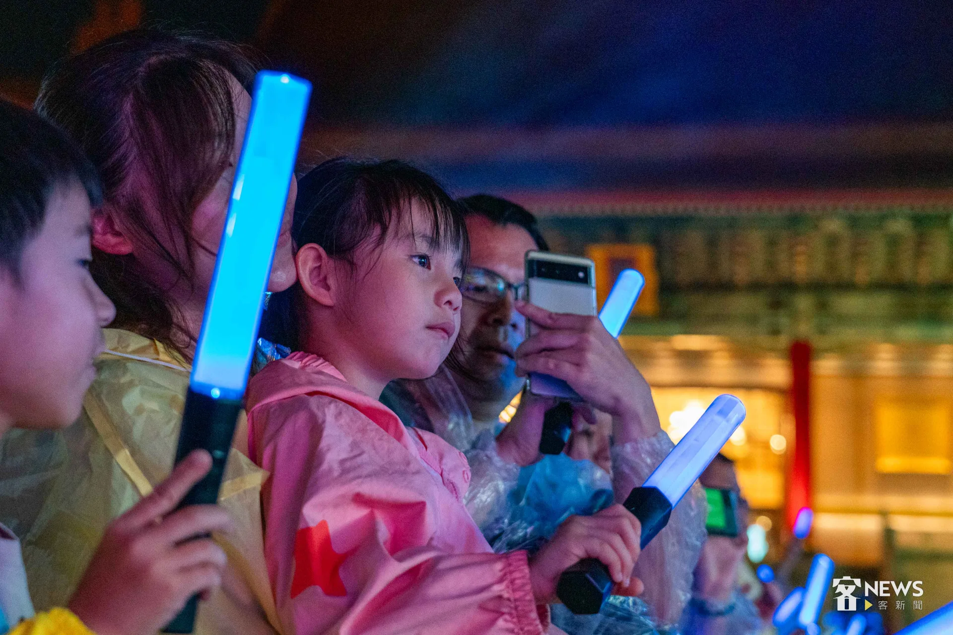 《燈怪》是客委會及紙風車劇團共同打造時尚又創新的客家親子劇,用童趣的寓言故事,傳達客家文化敬天惜物、尊重自然的「永續」精神。今天下午開始,台北市就開始下起一陣一陣的雨,但傍晚6點多,現場3千個座位已經8成滿;7點開演後,雨勢漸大,每個人穿起現場發放的透明雨衣,雨勢伴隨演出,一點都不減現場民眾興致。