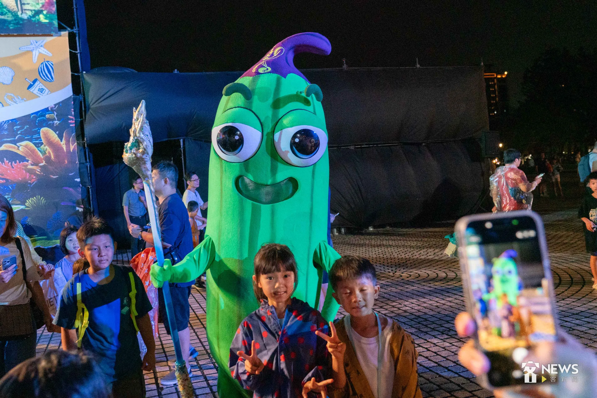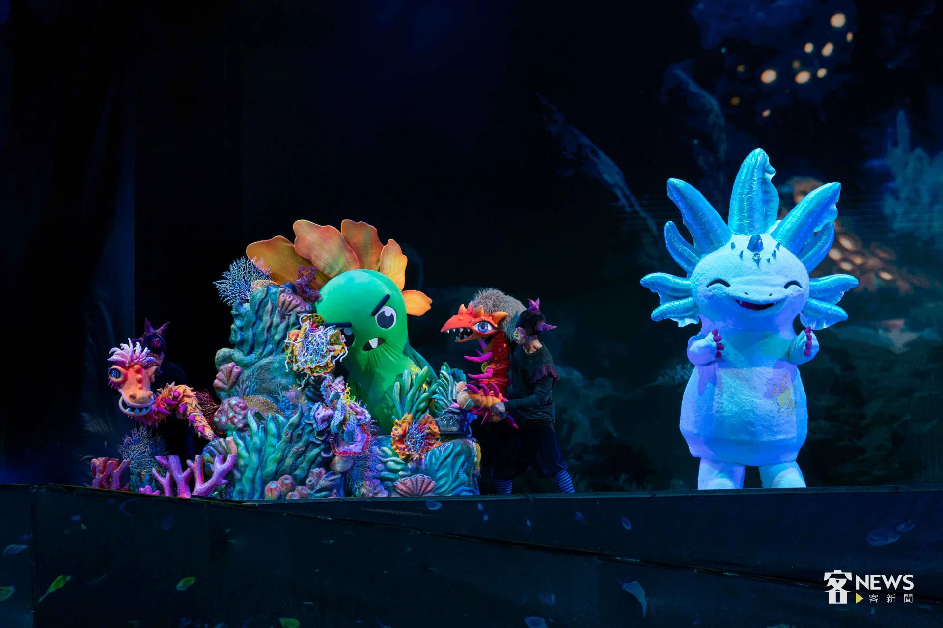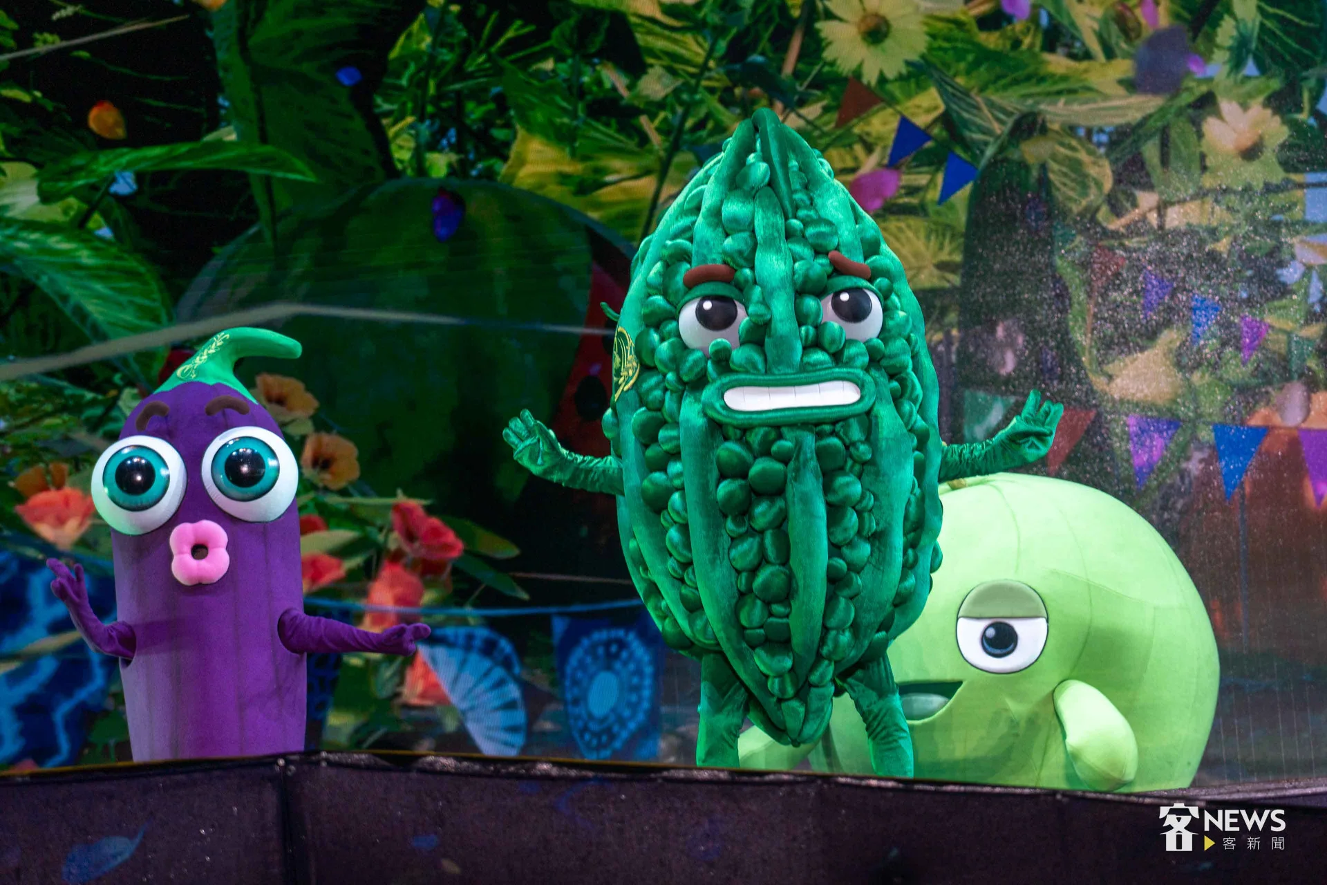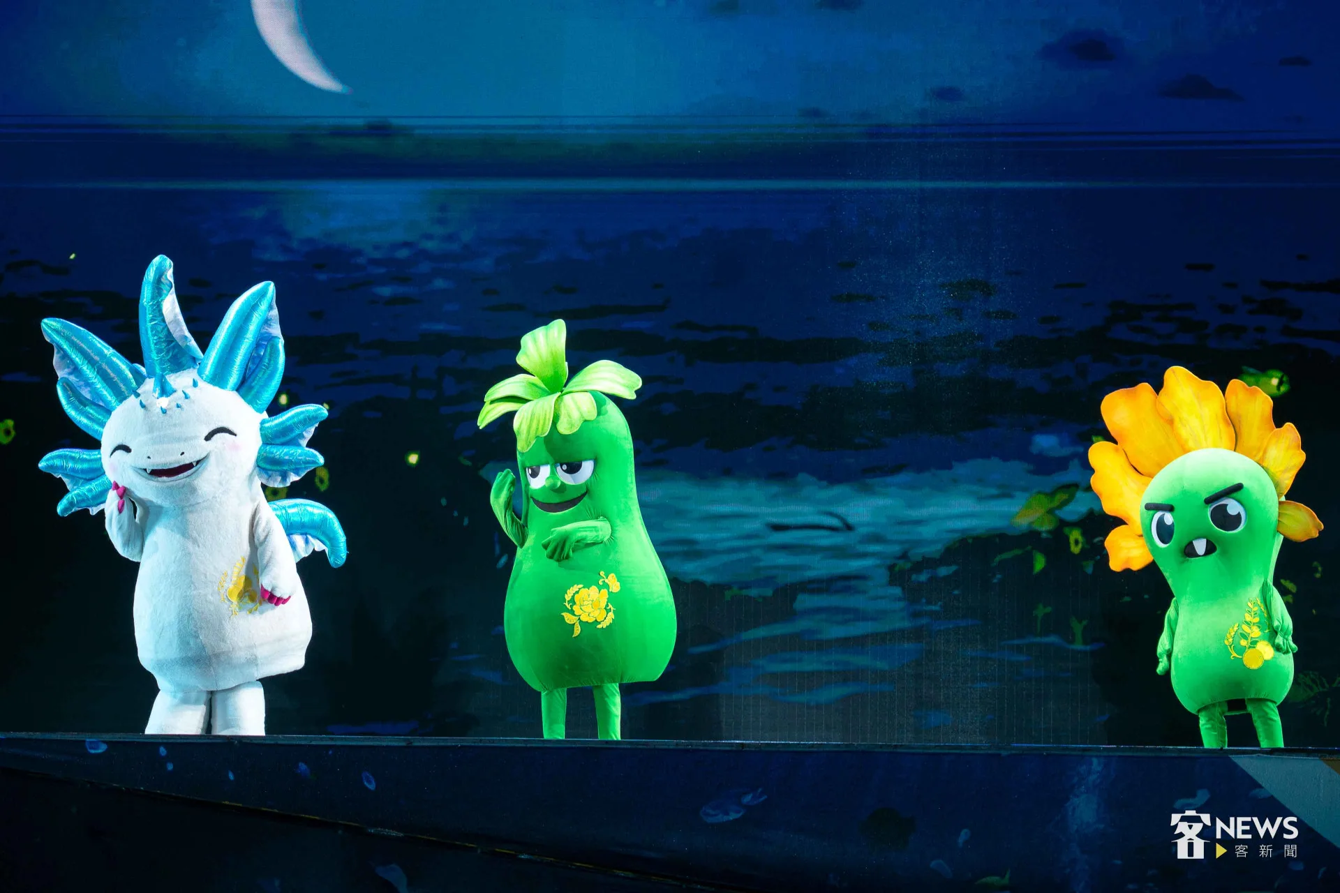 紙風車劇團今晚安排15隻呆萌的「瓜族」、「燈族」玩偶,演出瓜瓜島和海底城堡,因為地球暖化遭逢的生存危機,搭配安排橋段讓現場小朋友一起參與,還有祭拜客家伯公等情節,既創新又有傳承,台詞雖然有許多客語,但演員華客雙語交叉演出,即使不會講客家話的民眾、小朋友,也都充分沒有理解困難。