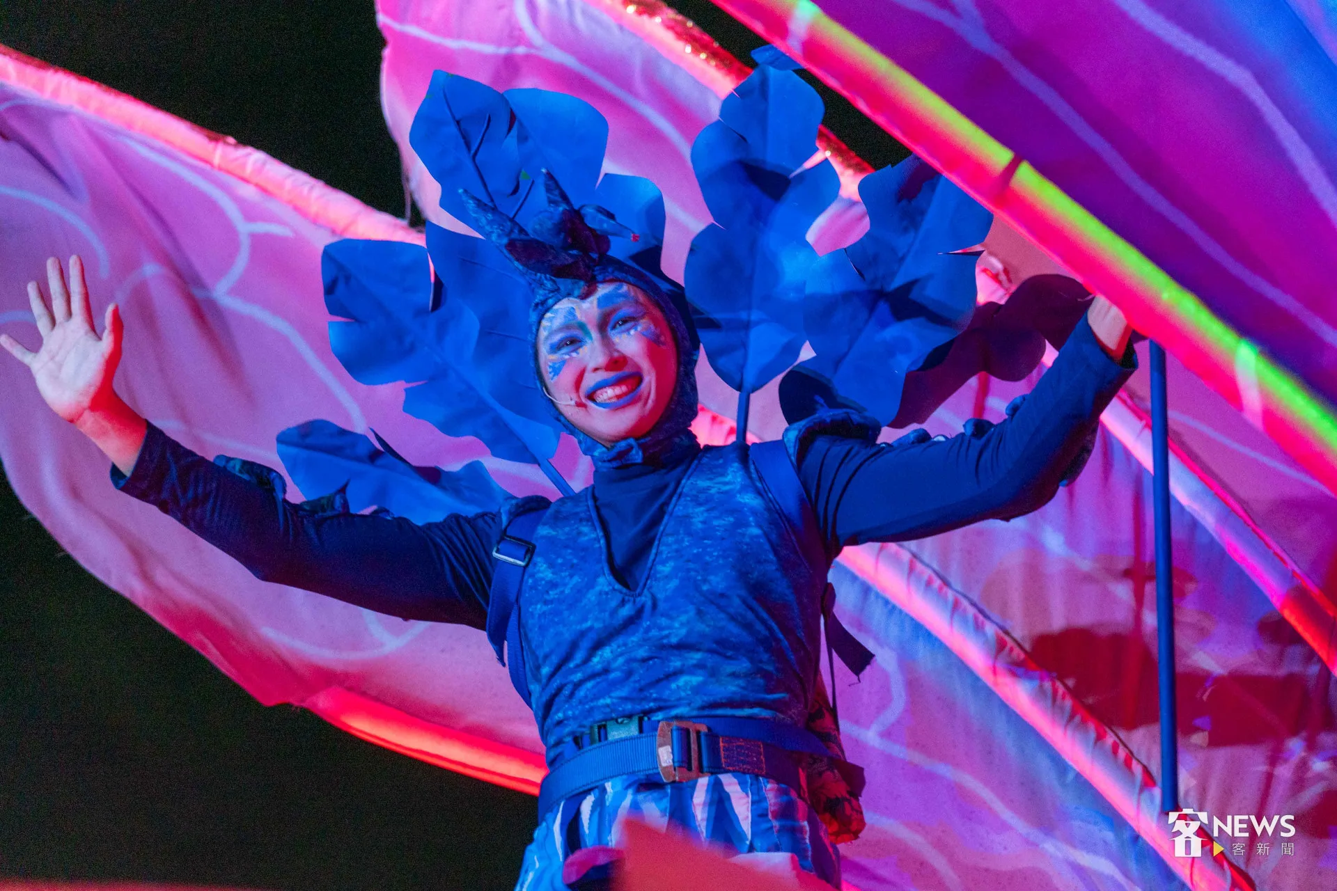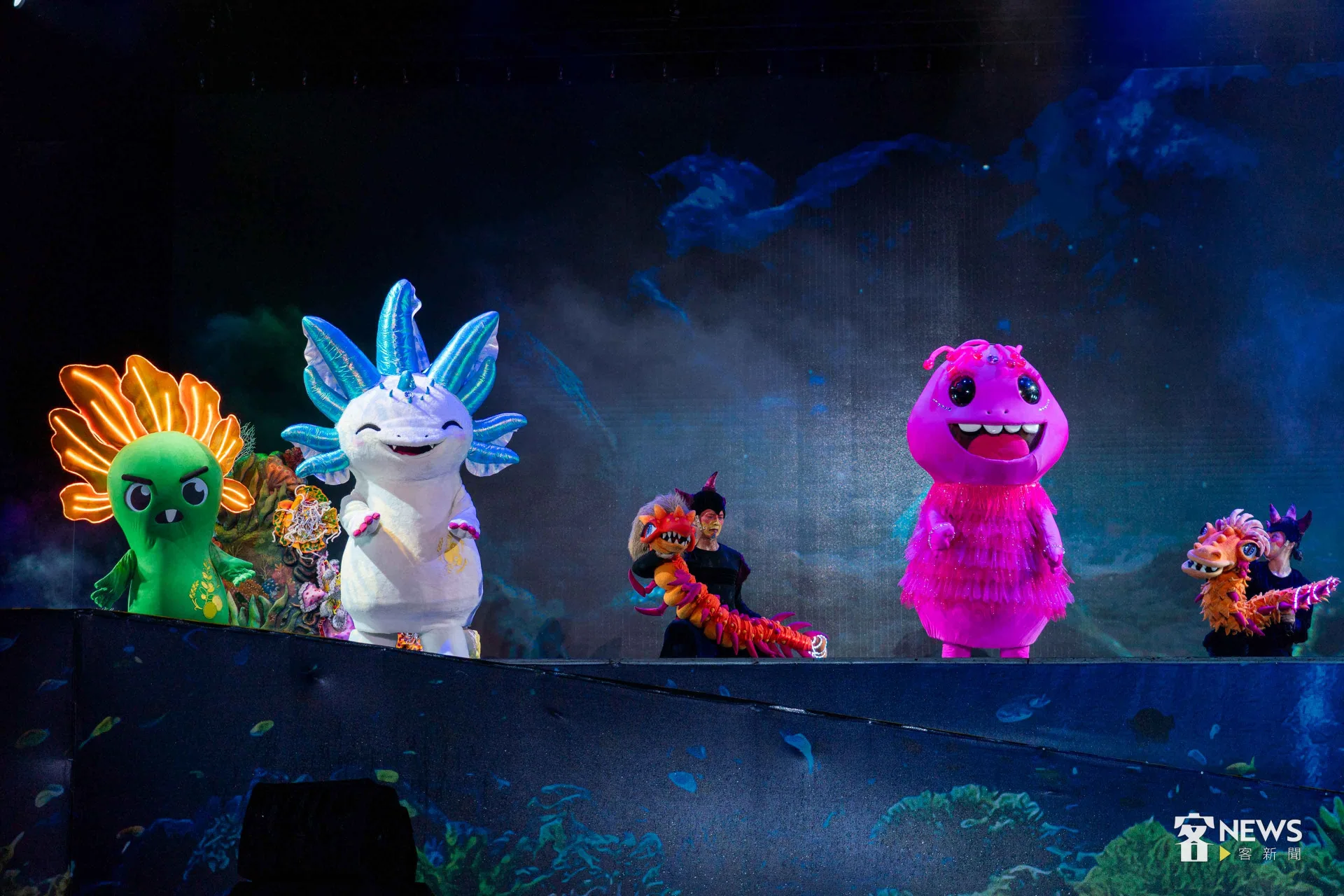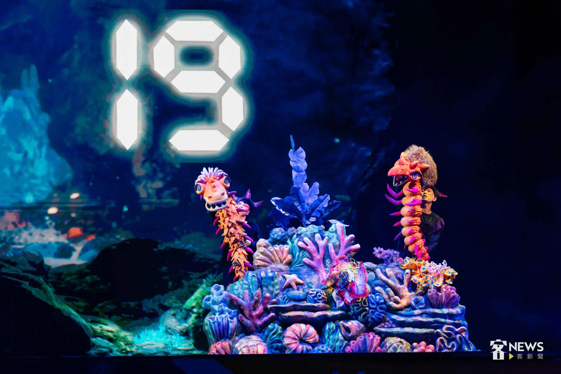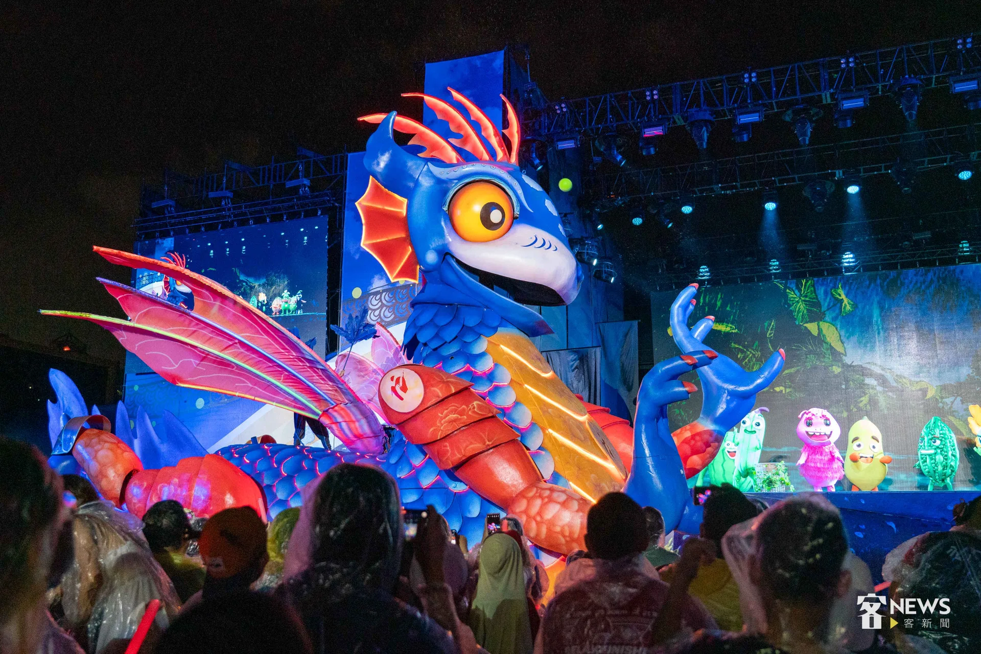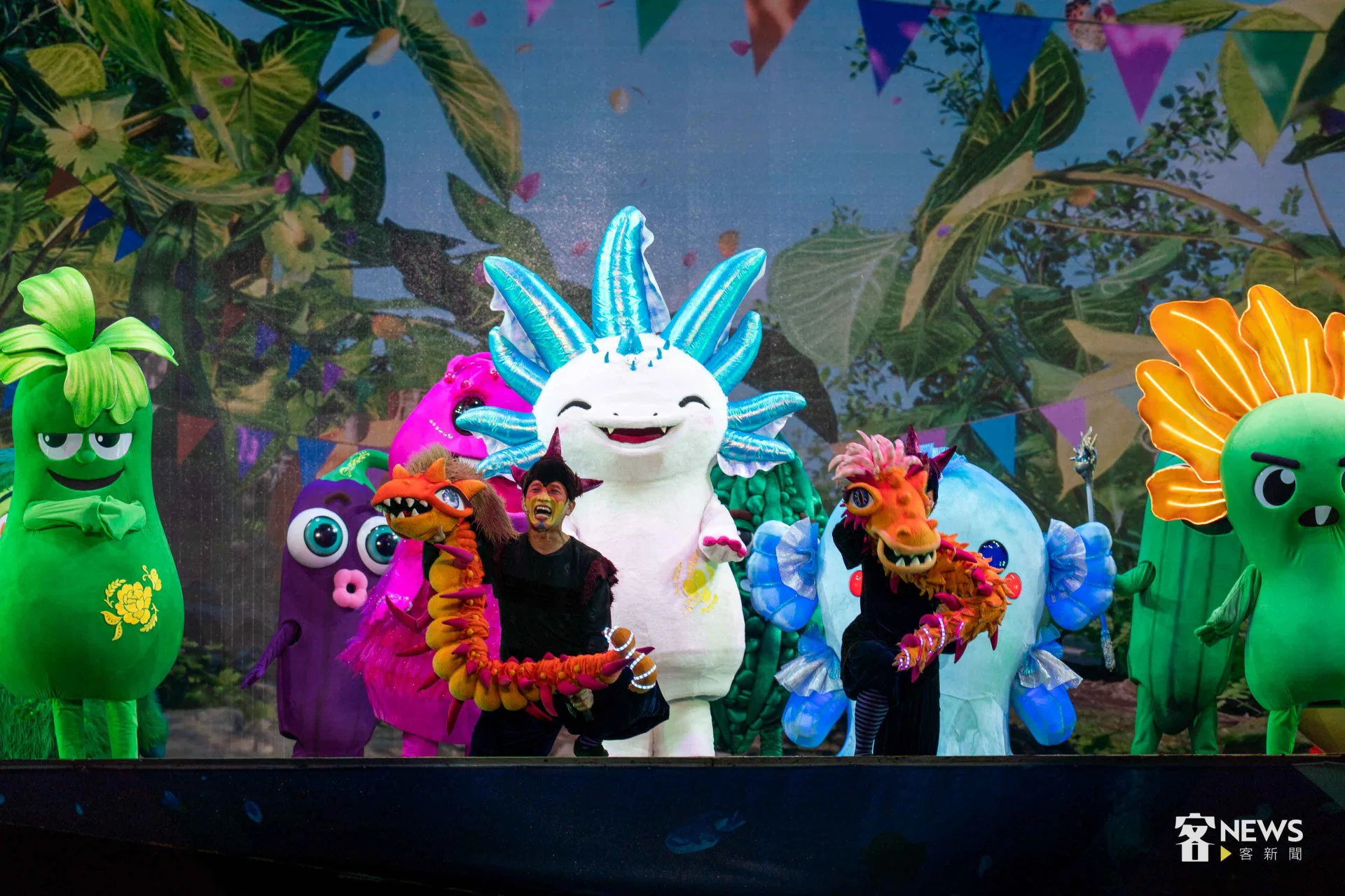 【李台源、章倩萍/台北報導】「1、2、3、4、5」4500多位大小朋友今天(19日)晚上7點,一起用客語高聲倒數,為客家委員會與紙風車劇團籌備近2年、聯合推出的2025客家親子劇《燈怪》首演,揭開序幕。8公尺高的巨型機械裝置「燈燈國王」,在一片螢光燈海中,從觀眾席現身,掀起陣陣驚呼,全場更齊聲高唱全新客語童謠〈瓜瓜歌〉,孩子的笑聲與掌聲不斷。