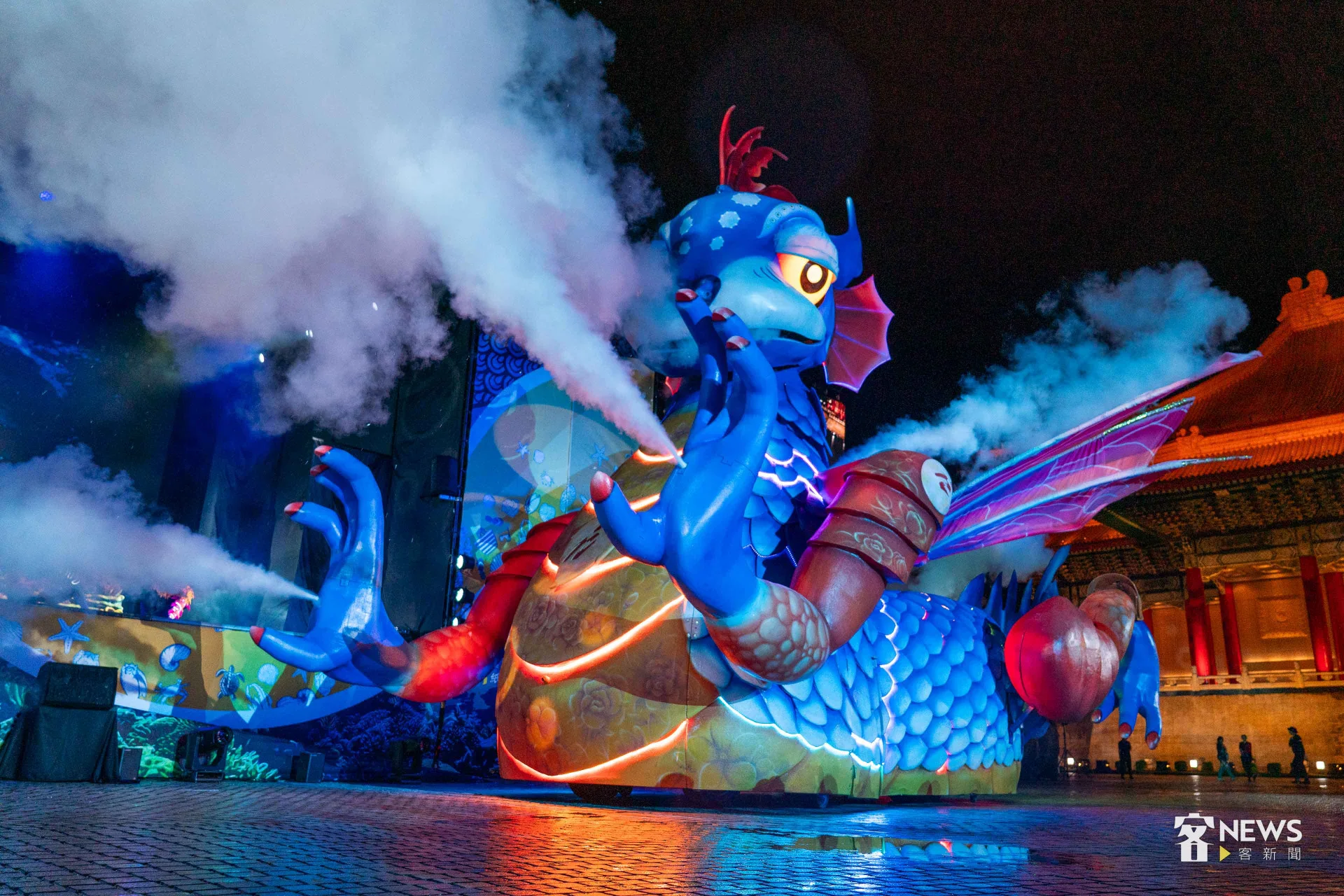 劇情快結束前,演出內容需要投餵「藍藻」給巨型「燈燈國王」吃,演員現場邀請客家委員會主任委員古秀妃、文化部長李遠,擔任「Team Taiwan」助手,投餵象徵「藍藻」的球,拋投到8公尺高的「燈燈國王」口中,古秀妃、李遠穿著雨衣,一次次的拋投,最後由不久前剛參加中華職棒台鋼雄鷹隊客家日活動開球的古秀妃,成功將球投進「燈燈國王」口中,讓地球、海洋暖化,獲得一線生機。