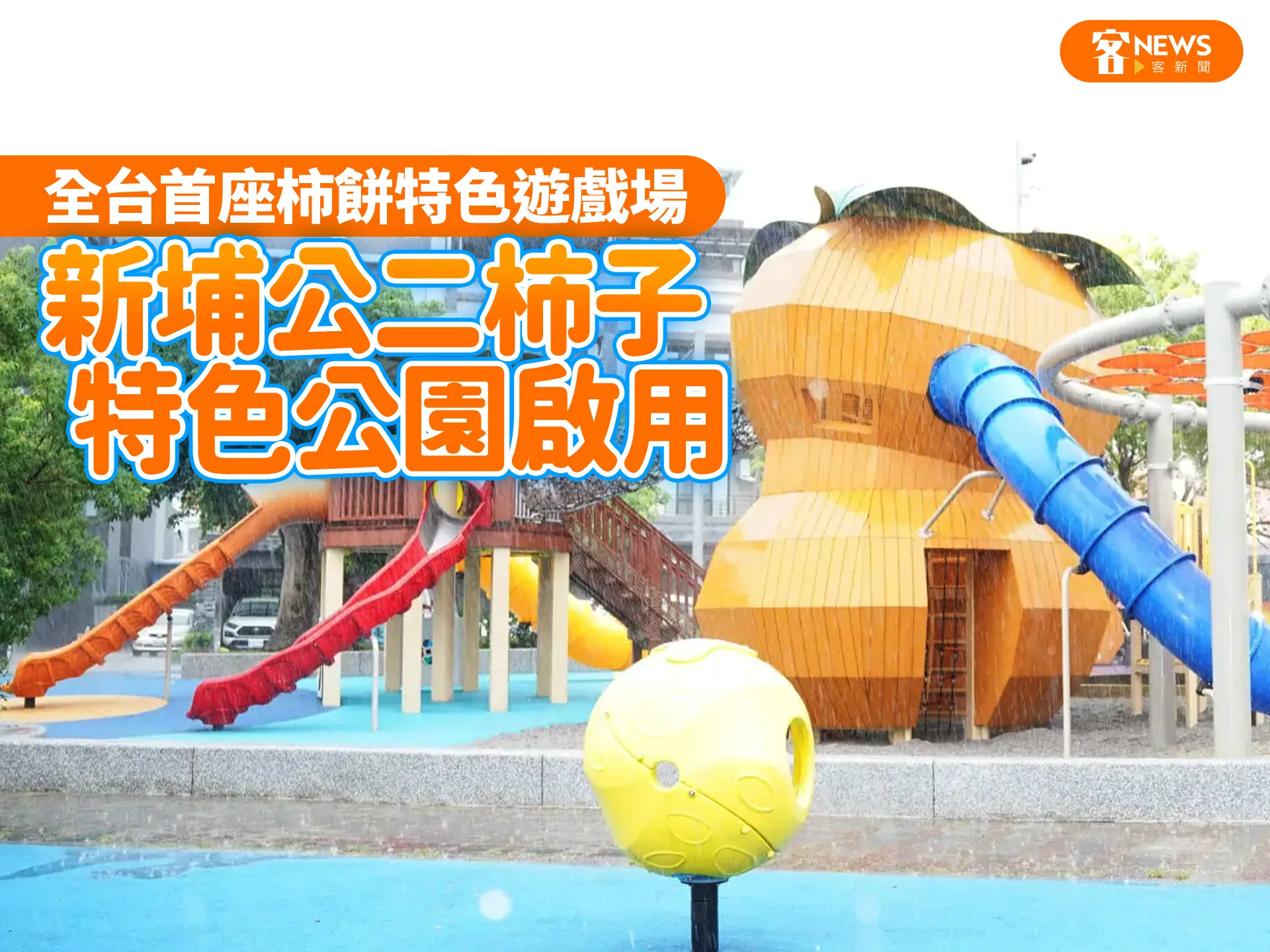 【客庄中心/綜合報導】新竹縣政府攜手新埔鎮公所,斥資1980萬元改造新埔鎮公二公園,原先簡易兒童遊樂設施的社區公園,搖身一變成為全台首座以「柿子」為主題的特色遊戲場。20日下午舉辦開幕儀式,雖遇滂沱大雨,新埔鎮民仍攜家帶眷參加,見證新公園啟用。